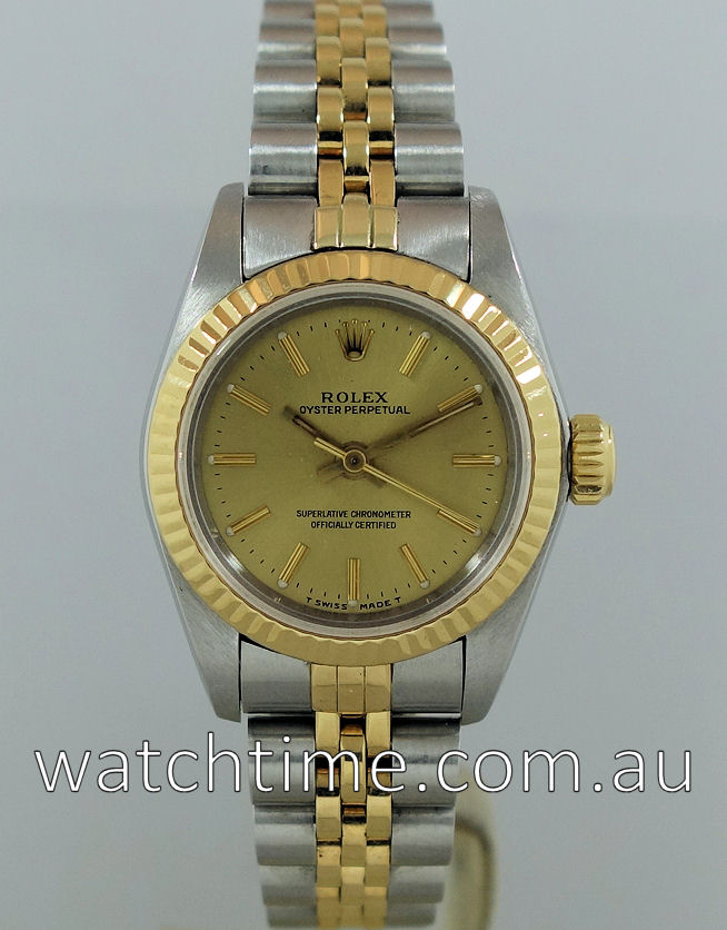 | Case | Stainless-steel and 18k Yellow-Gold fluted bezel with screw-down crown and Sapphire crystal glass. |