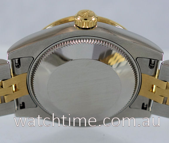 | Dial | Factory Silver sunburst Diamond dial, gold hands and date at 3 h pos. |