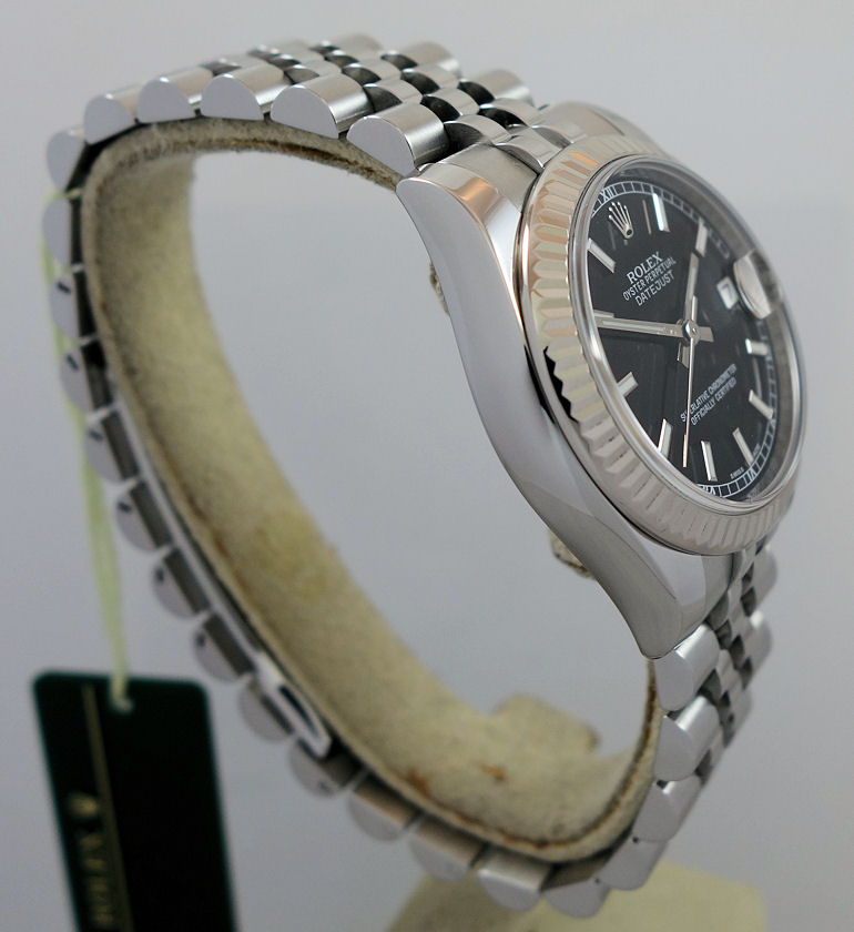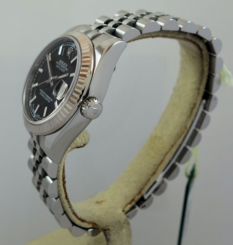 | Dial | Black dial with applied hour indices and matching hands. Date at 3 o’clock. |