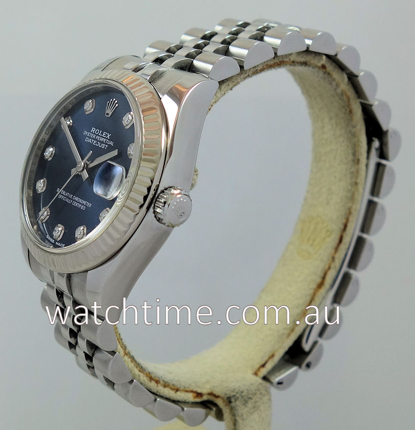 | Dial | Blue sunburst dial with 10 Diamonds, white-gold hands and date at 3 h pos. |