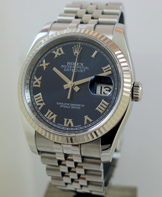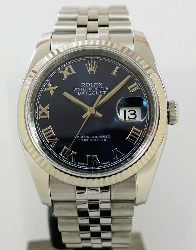 | Dial | Blue sunburst dial with Roman numerals. Date at 3 o’clock. |
