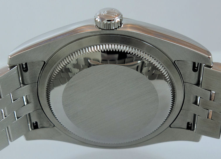 | Case | Stainless-Steel Oyster case with screw-down crown and 18k White-Gold fluted bezel. Sapphire crystal glass. |