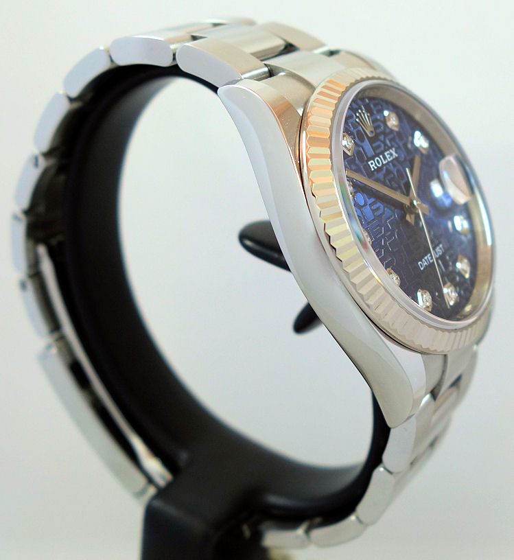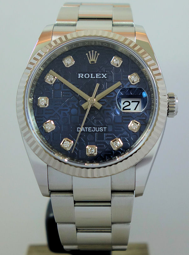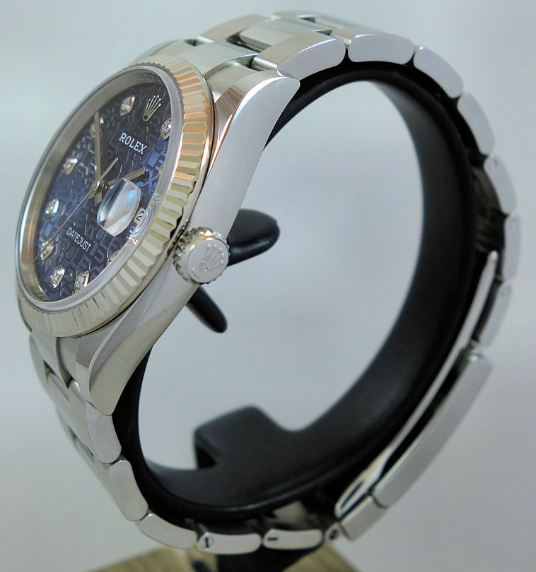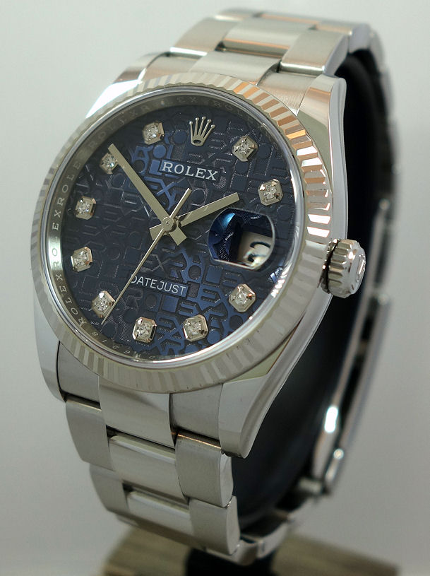Blue Jubilee Diamond dial with white-gold hands and date at 3 o’clock.