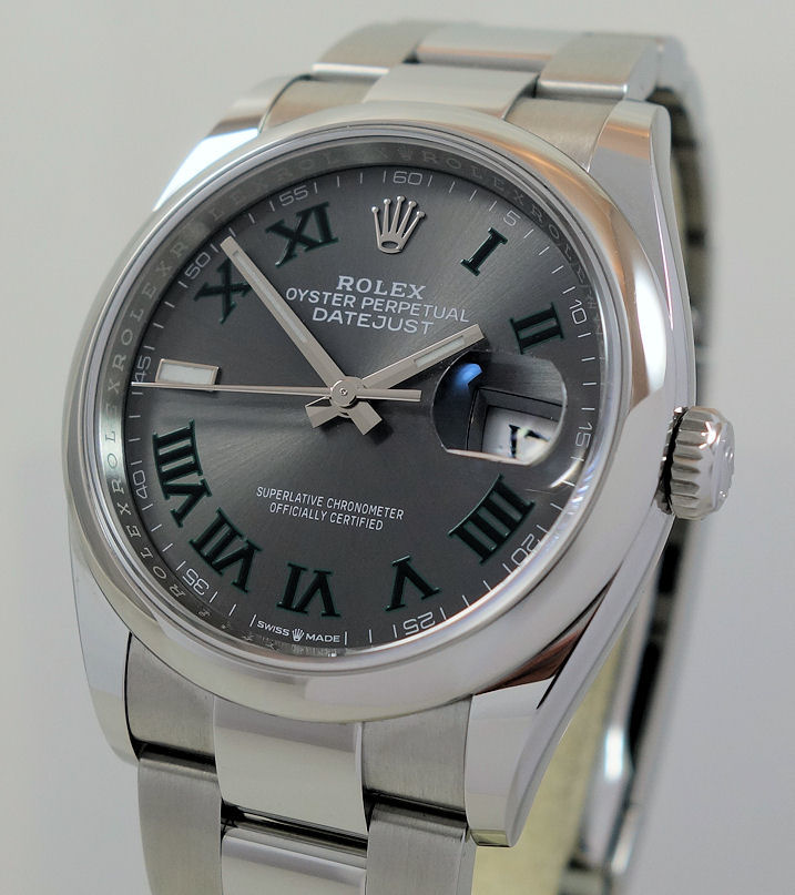 | Dial | “Wimbledon” Slate-grey sunburst dial with black / green Roman numerals, white-gold & luminous hands and date at 3 o’clock. |