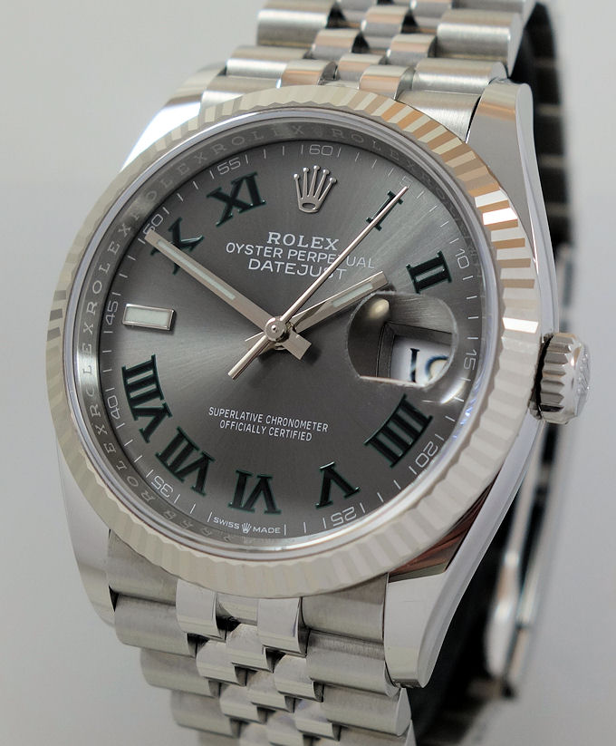 | Dial | “Wimbledon” Slate-grey sunburst dial with black / green Roman numerals, white-gold & luminous hands and date at 3 o’clock. |