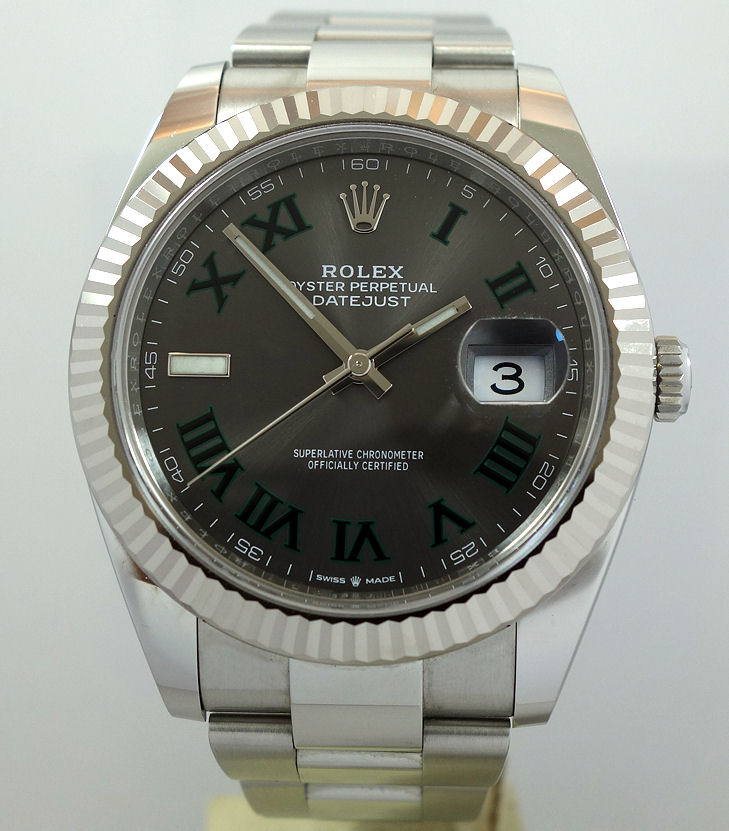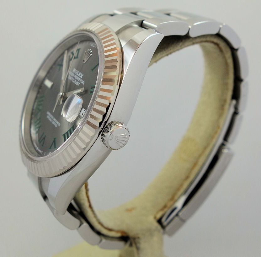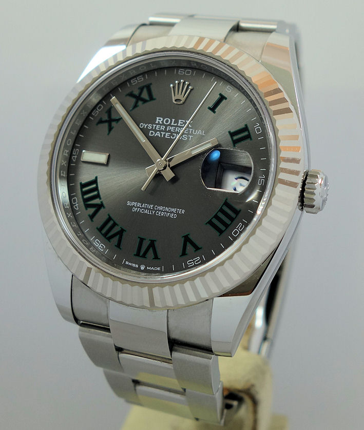 | Dial | “Wimbledon” Slate-grey sunburst dial with black / green Roman numerals, white-gold & luminous hands and date at 3 o’clock. |