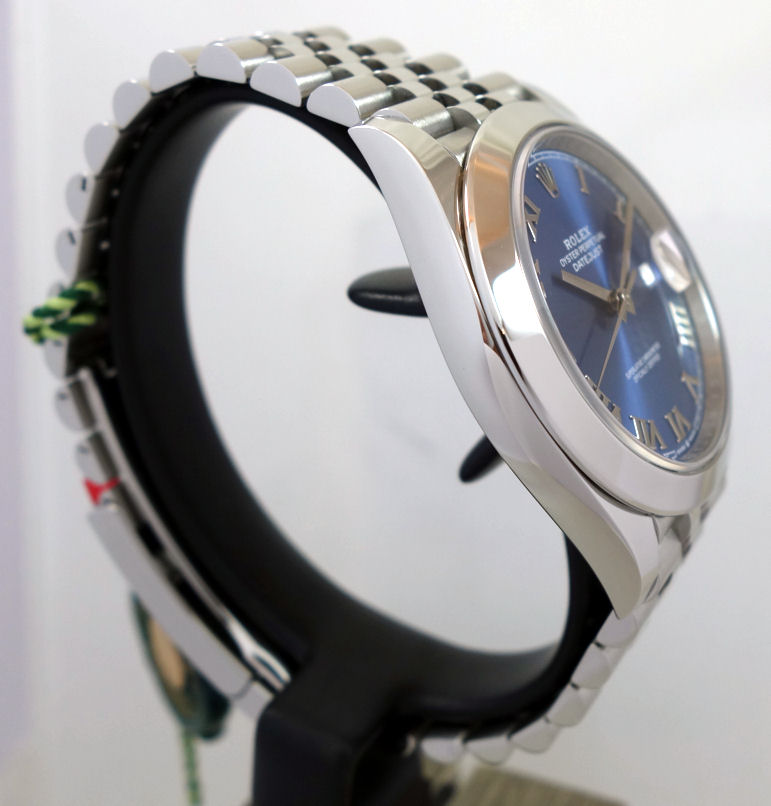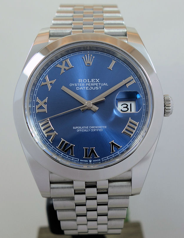 | Dial | Blue sunburst dial with Roman numerals. Date at 3 o’clock. |