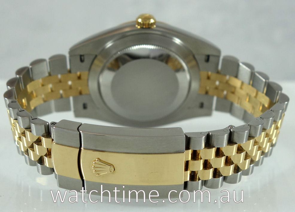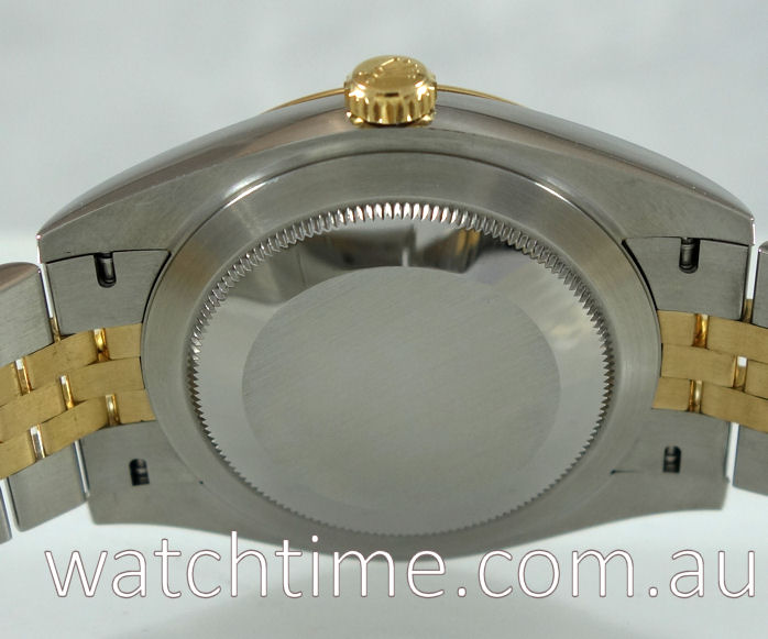 | Case | Stainless-steel Oyster case with screw-lock winding crown and 18k Yellow-Gold fluted bezel. Sapphire crystal glass with cyclops over the date for magnification. |