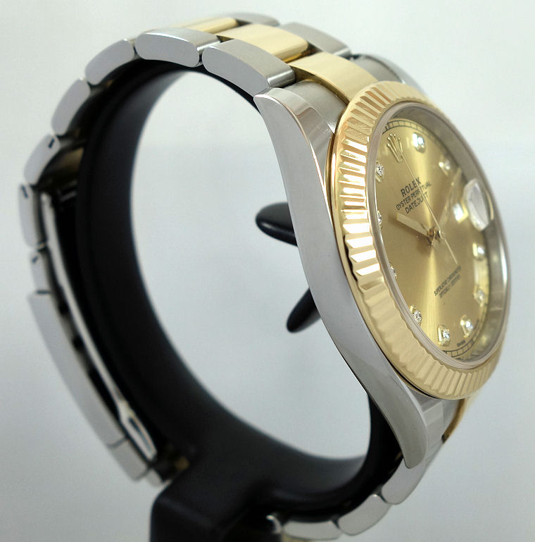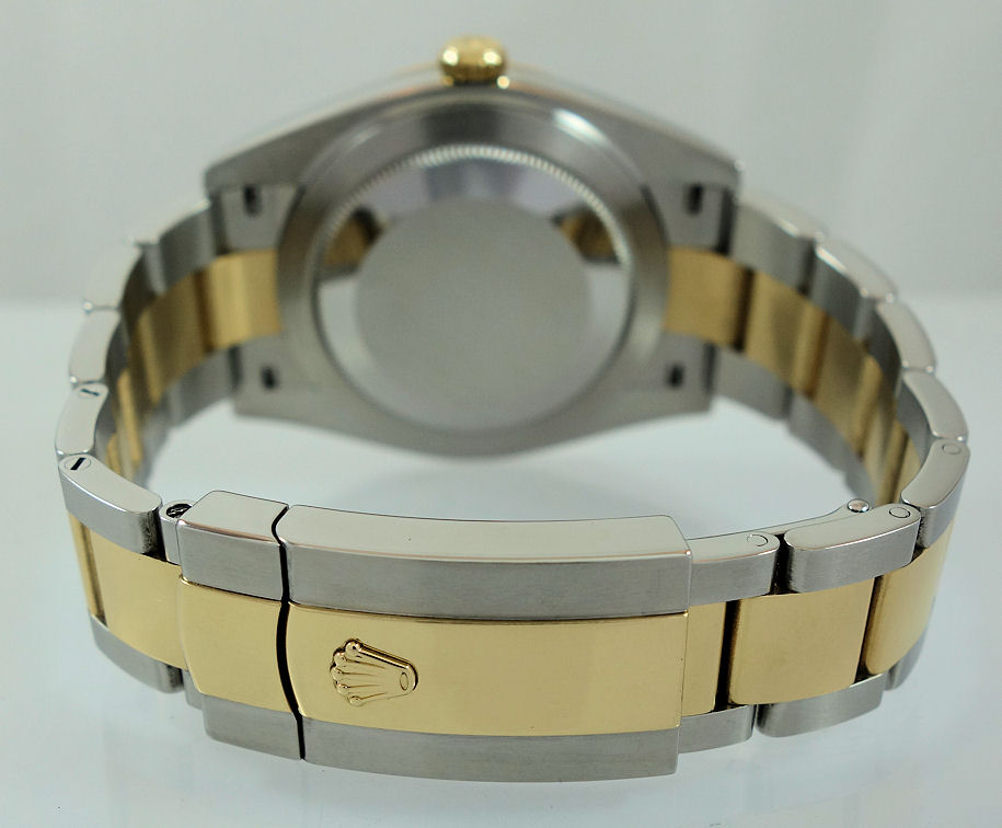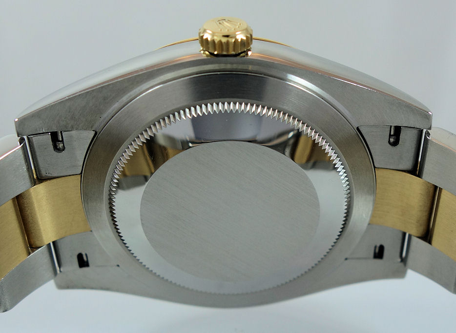 | Case | Stainless-steel Oyster case with screw-lock winding crown and 18k Yellow-Gold fluted bezel. Sapphire crystal glass with cyclops over the date for magnification. |