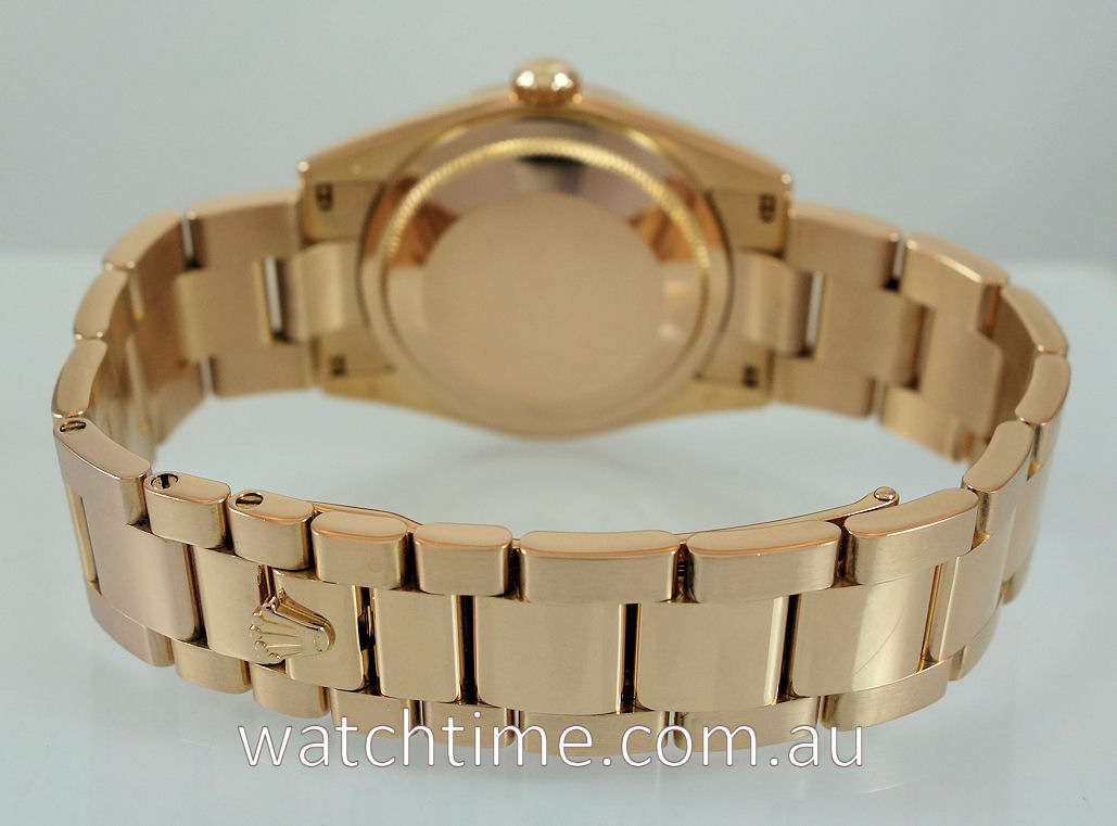 | Dial | Pink sunburst dial with applied Roman numerals and contrasting black/gold hands. |