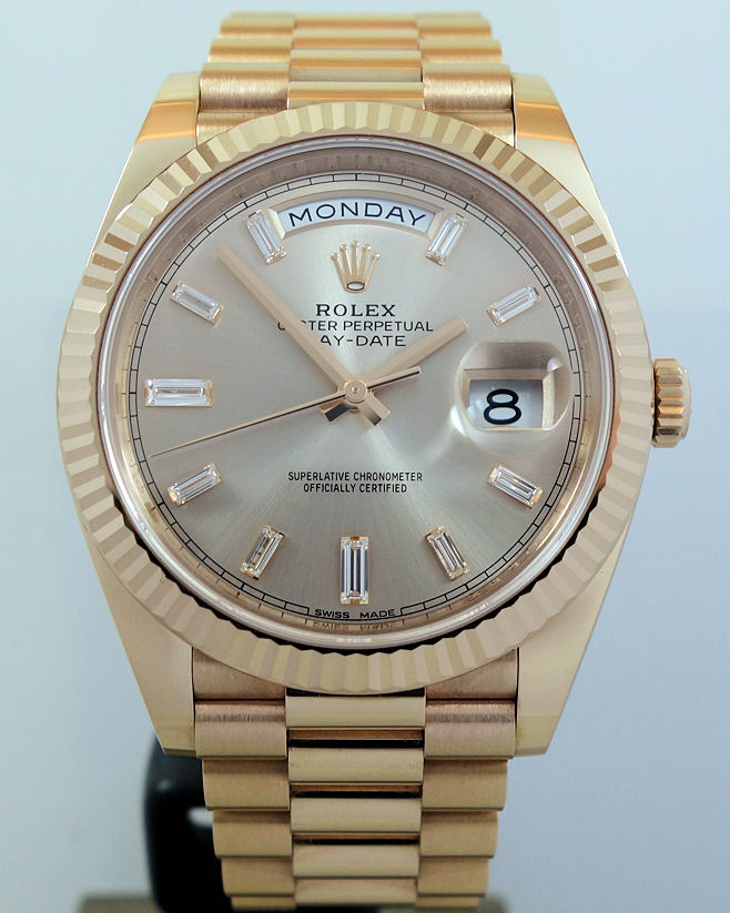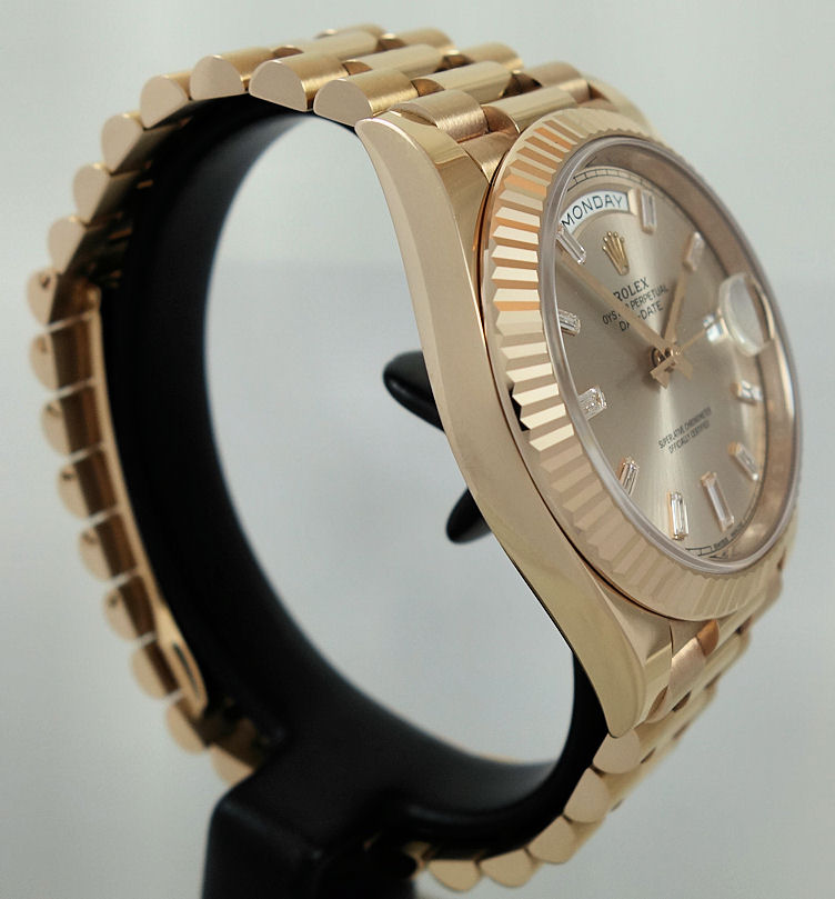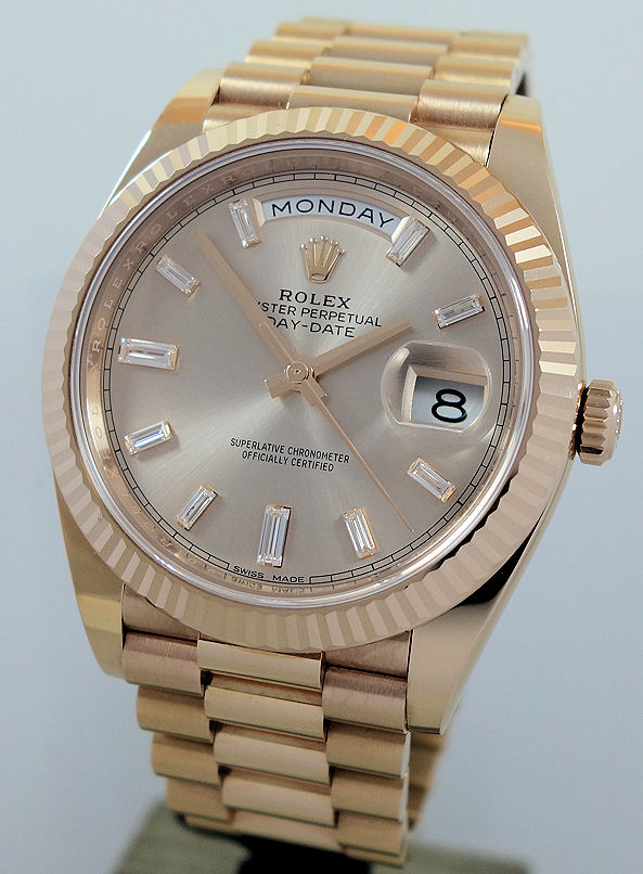 Pink-Champagne Sundust dial features 10 baguette-cut Diamonds. Day above 12 and Date window at 3 o’clock.
