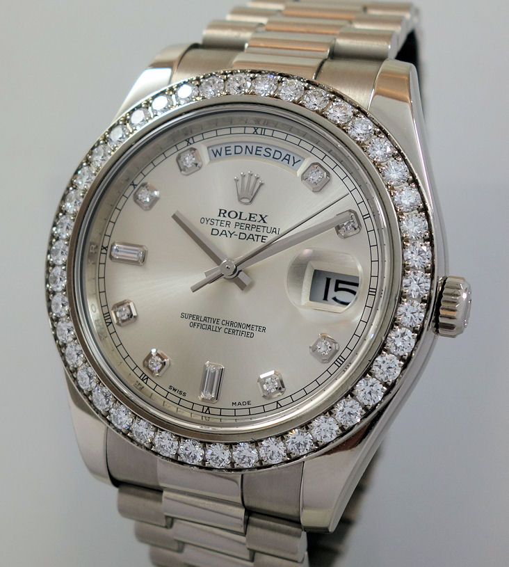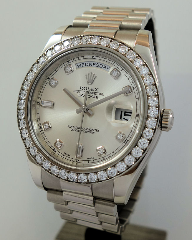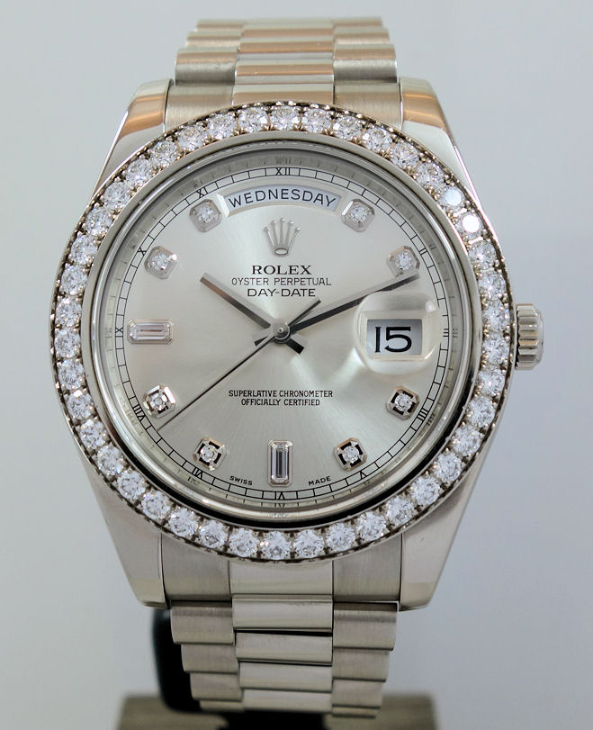 | Dial | Silver Diamond-dial with brillant & baguette Diamonds, white-gold hands, day window below 12 and date at 3 o’clock. |