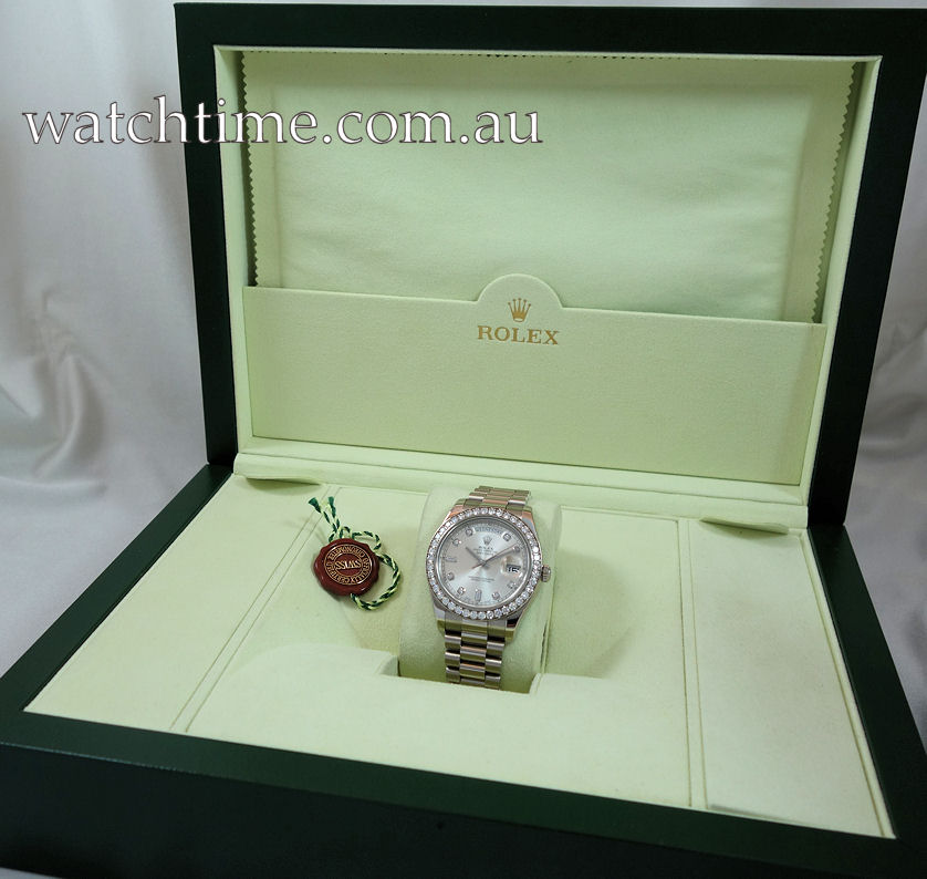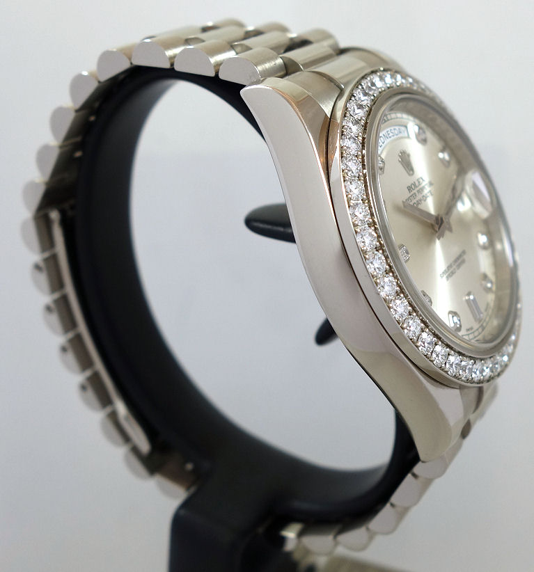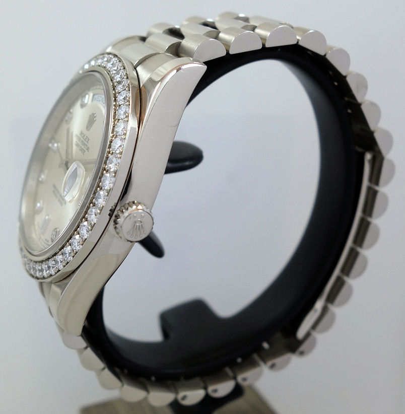 NOW DISCONTINUED in 41mm, this 18K White-Gold Rolex “Day-Date II” President (ref # 218349) with Rolex Factory Silver Diamond Dial (Brilliant-cut & Baguette Diamonds) and Diamond Bezel.