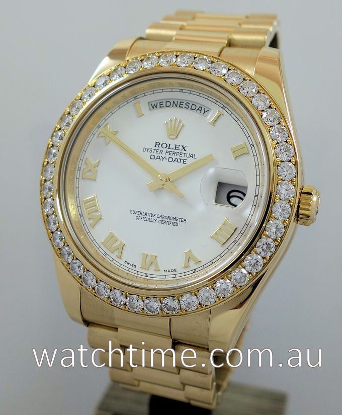 | Case | 18ct Yellow-Gold Oyster case with screw-down winding crown and Sapphire crystal glass. After-market Diamond bezel. |