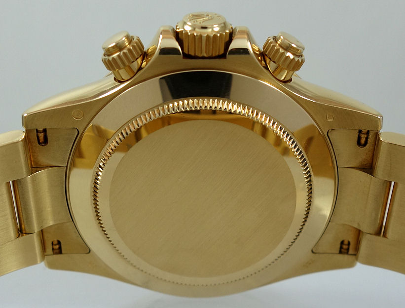 18k Yellow Gold oyster case with screw-lock winding crown & pushers, bezel engraved with Tachymetre scale and Sapphire crystal glass.