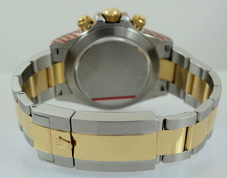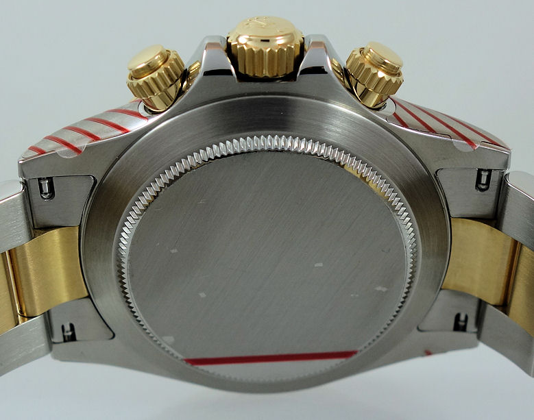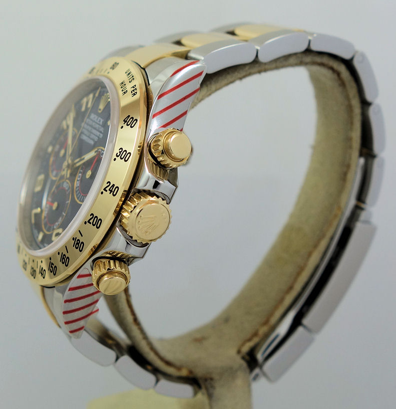 | Case | Stainless-steel Oyster case, screw-down crown and pushers, 18k Yellow-Gold bezel with Tachymetre scale and Sapphire crystal glass. |