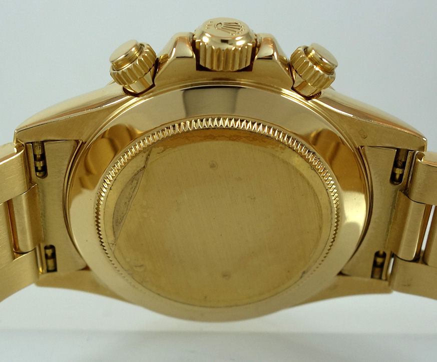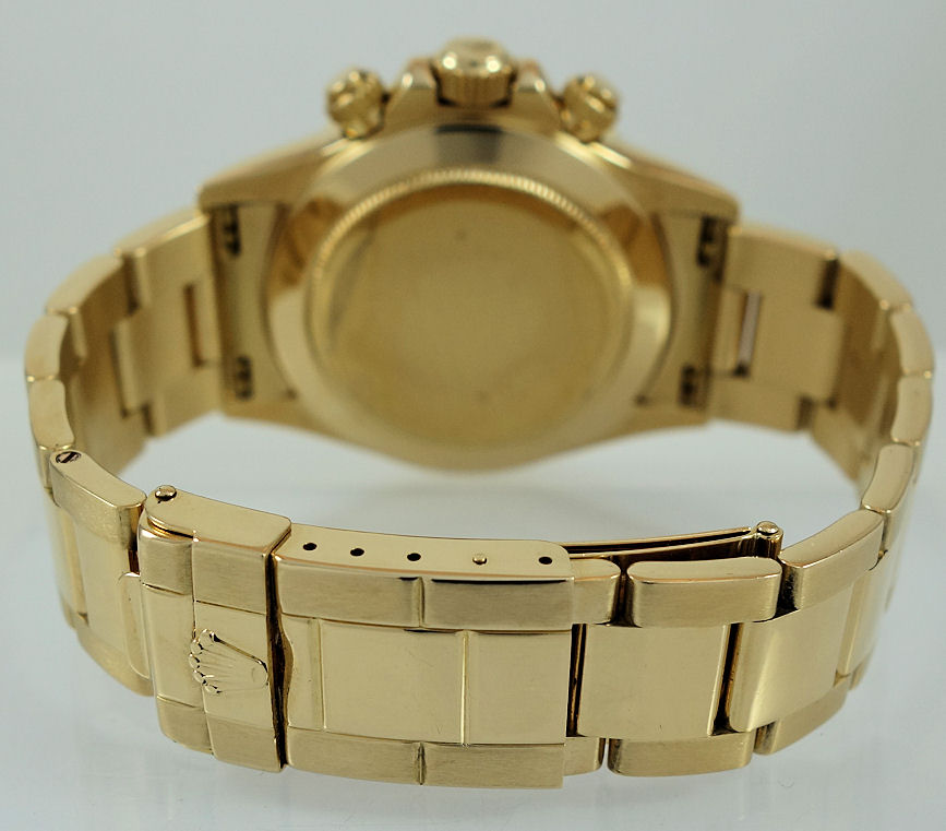 18k Yellow Gold oyster case with screw-lock winding crown & pushers, bezel engraved with Tachymetre scale and Sapphire crystal glass.
