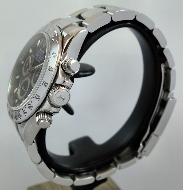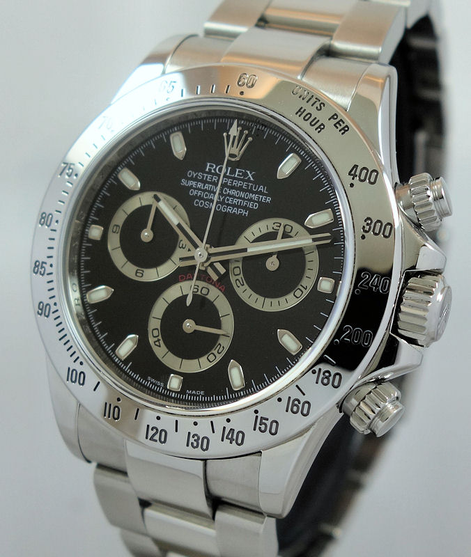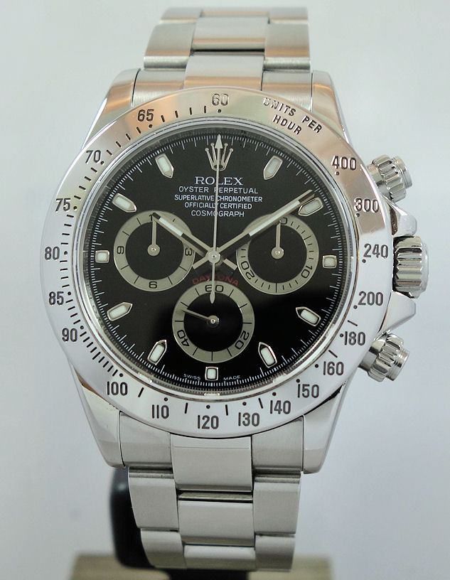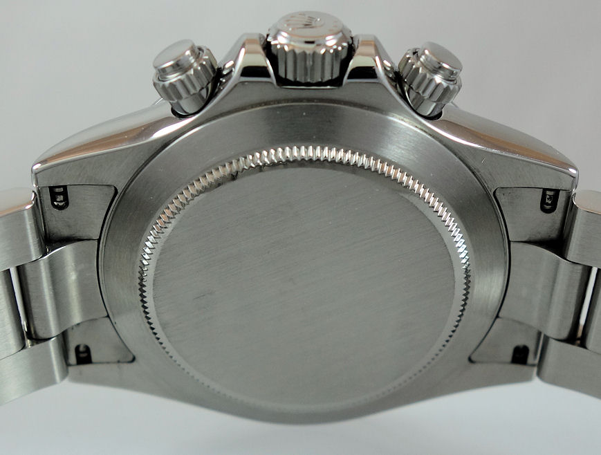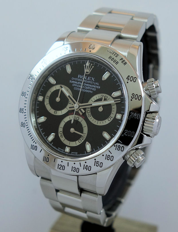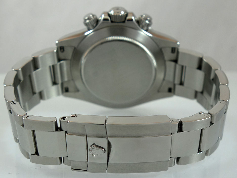 | Case | Stainless-steel Oyster case, fixed bezel with Tachymetre scale and screw-down pushers & crown. Sapphrie crystal glass. |