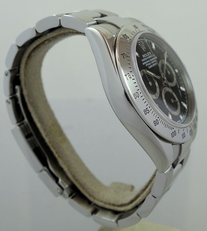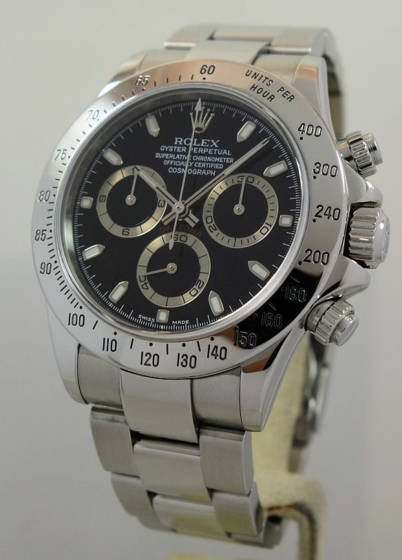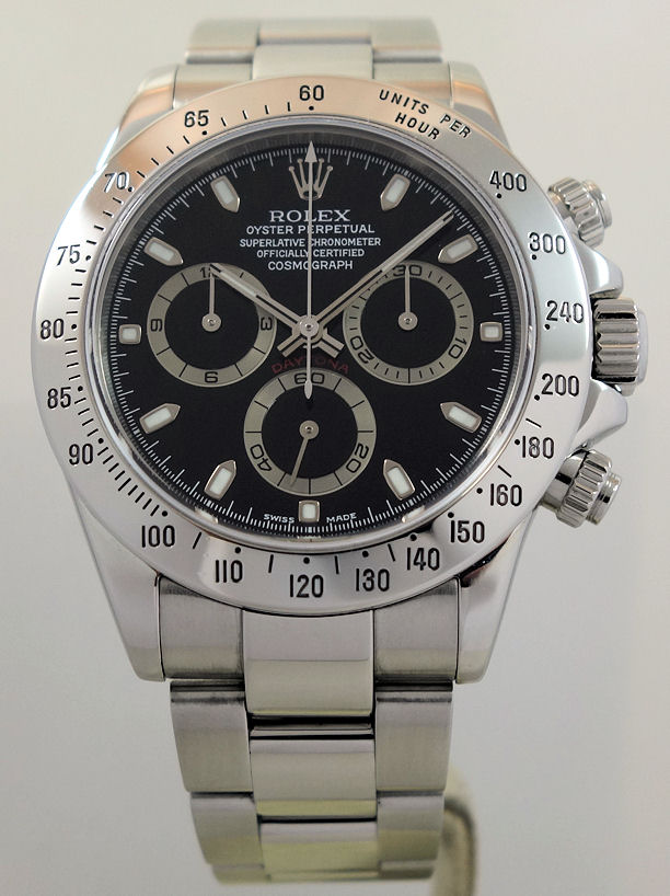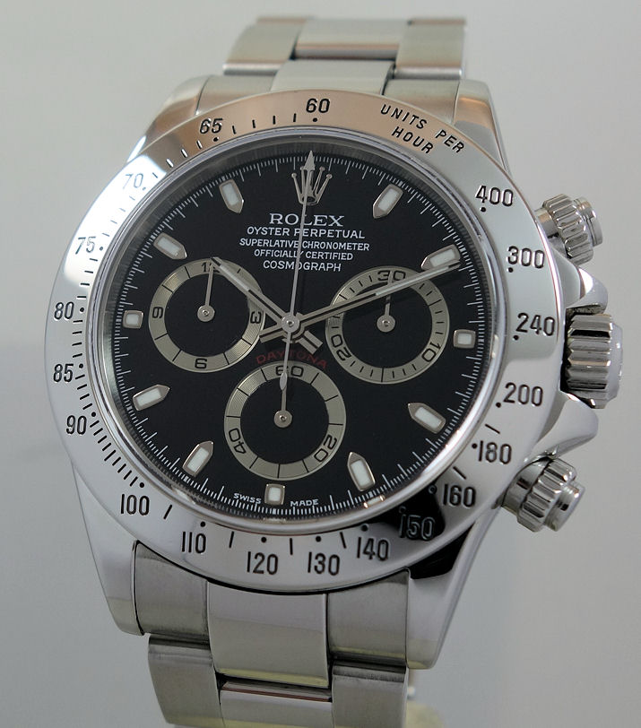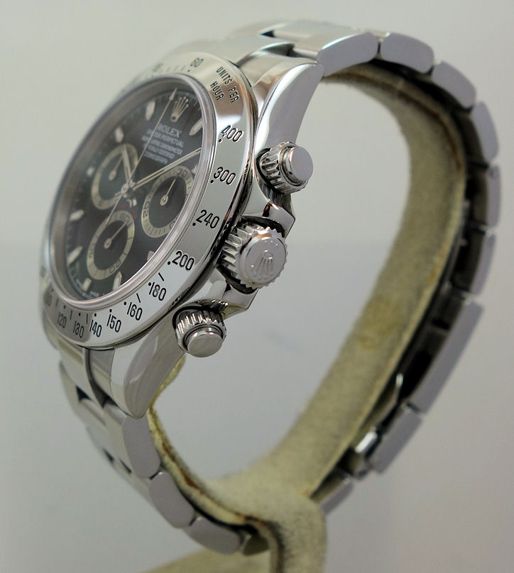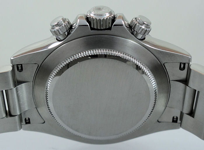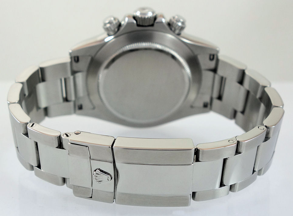 | Case | Stainless-steel Oyster case, fixed bezel with Tachymetre scale and screw-down pushers & crown. Sapphrie crystal glass. |
