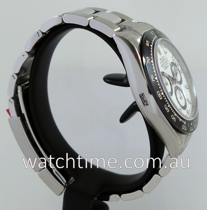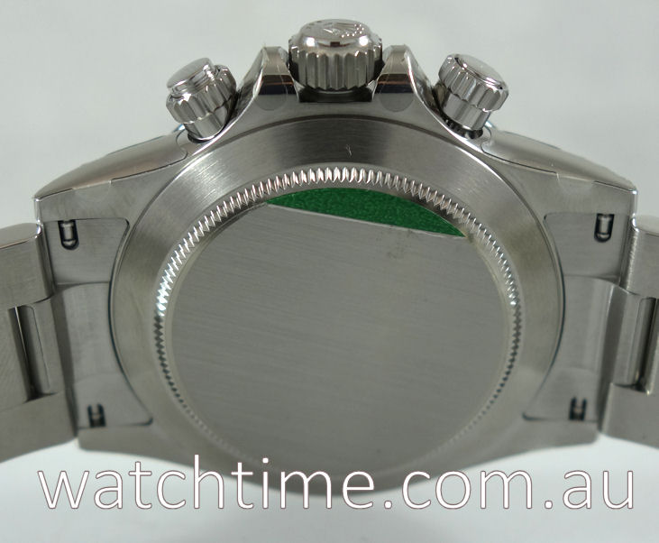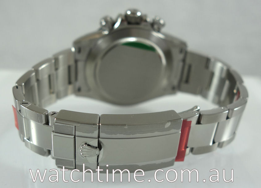 Stainless-steel Oyster case, black Ceramic bezel with Tachymetre scale, screw-down crown and pushers. Sapphire crystal glass.