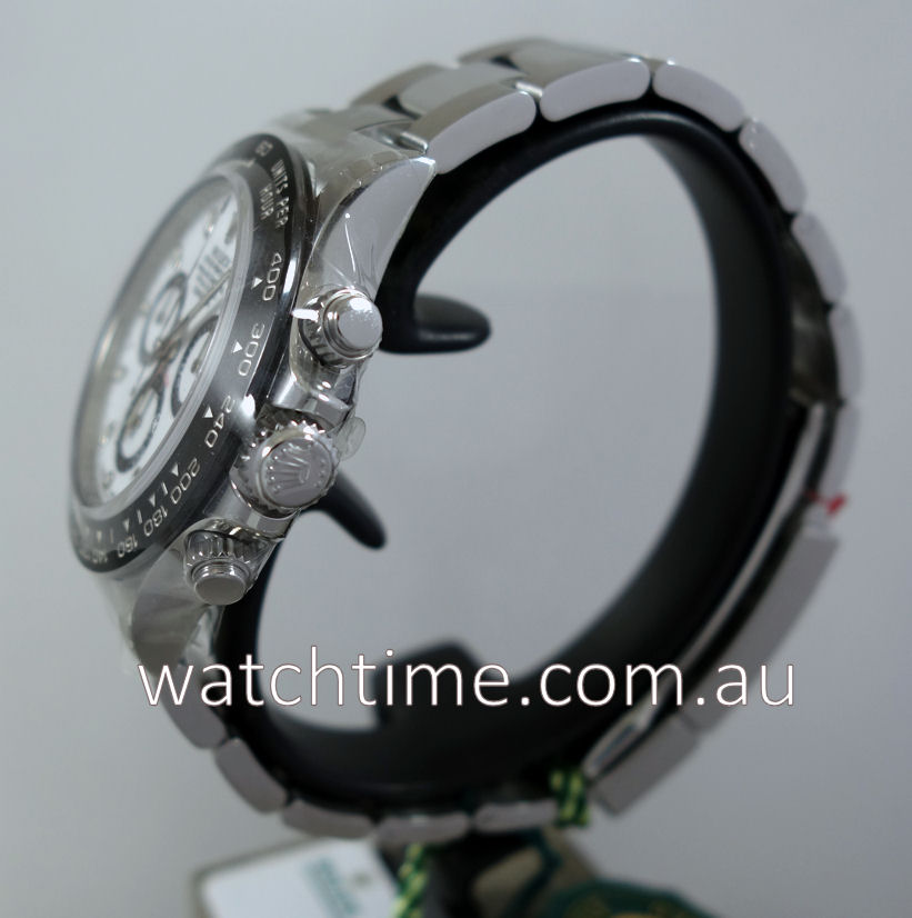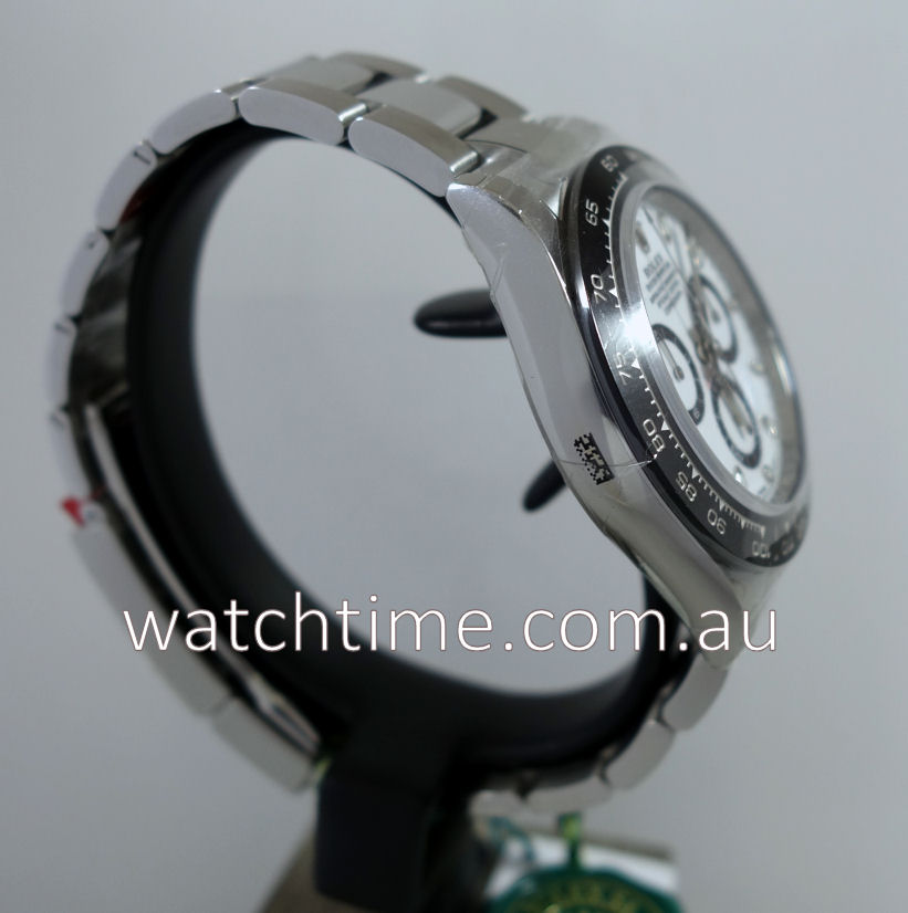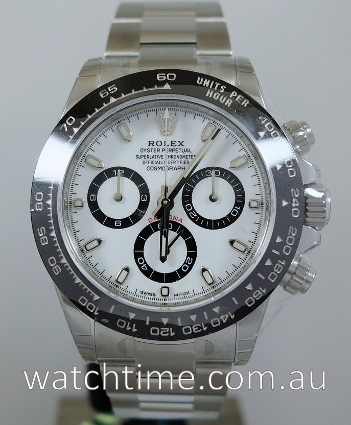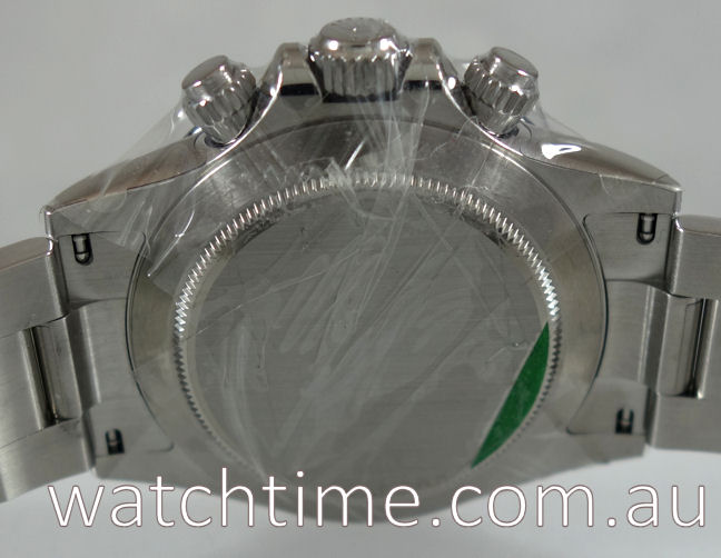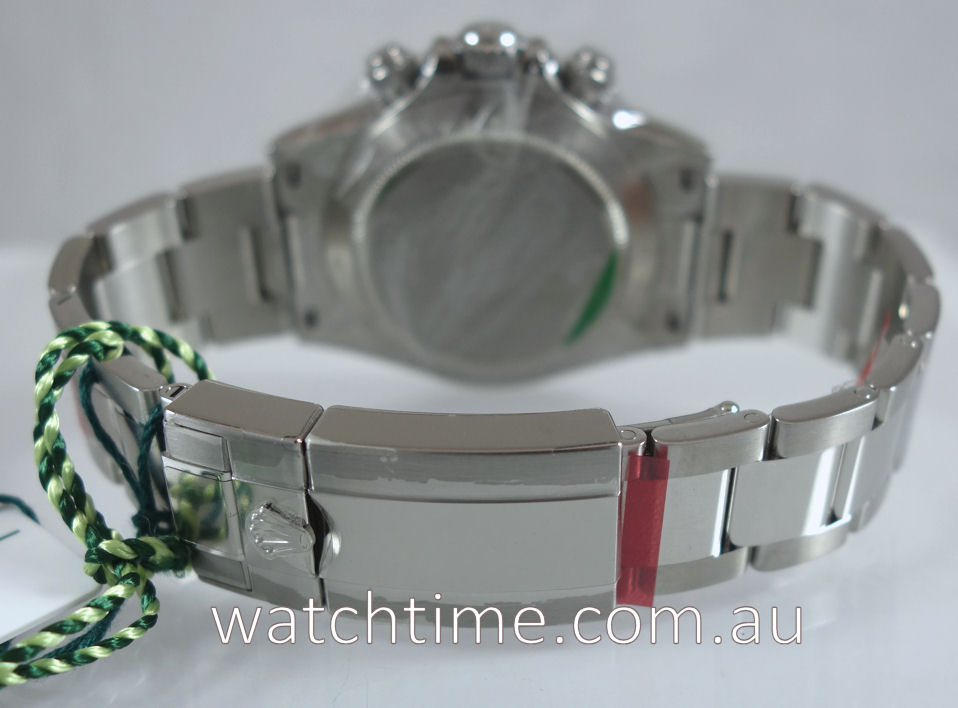 | Case | Stainless-steel Oyster case, black Ceramic bezel with Tachymetre scale, screw-down crown and pushers. Sapphire crystal glass. |