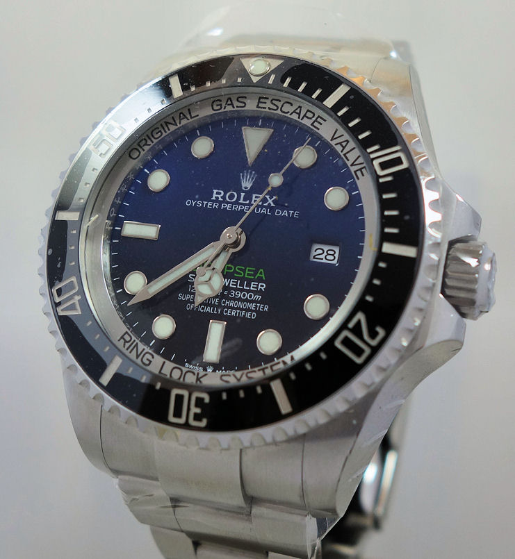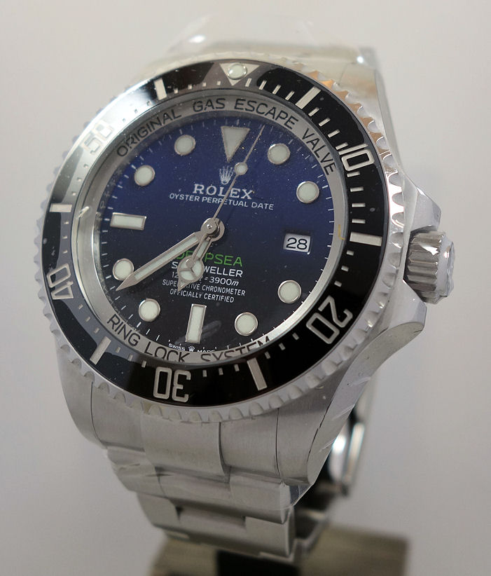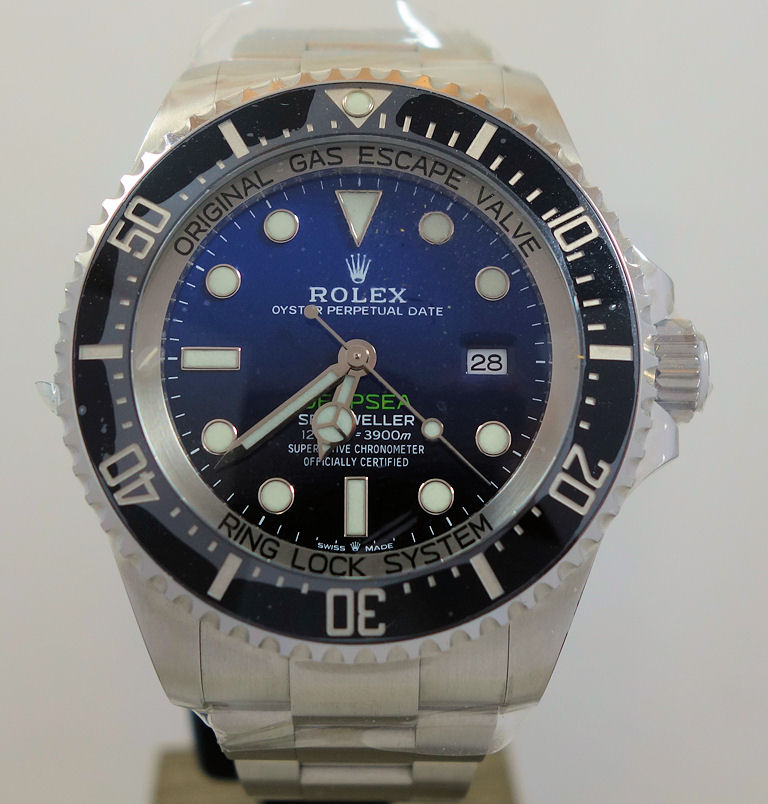 “Commemorating James Cameron’s historic solo dive. From brilliant blue to bottomless black, its two-colour gradient dial celebrates one man’s journey to the deepest place on earth: the bottom of the Mariana Trench. Waterproof to a depth of 3,900 metres (12,800 feet) with a unidirectional 60-minute rotatable bezel, the Rolex Deepsea is amongst the ultra-resistant divers’ watches engineered by Rolex for deep-sea exploration.”
