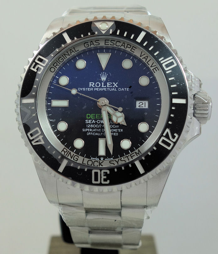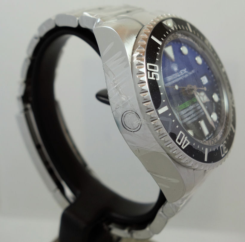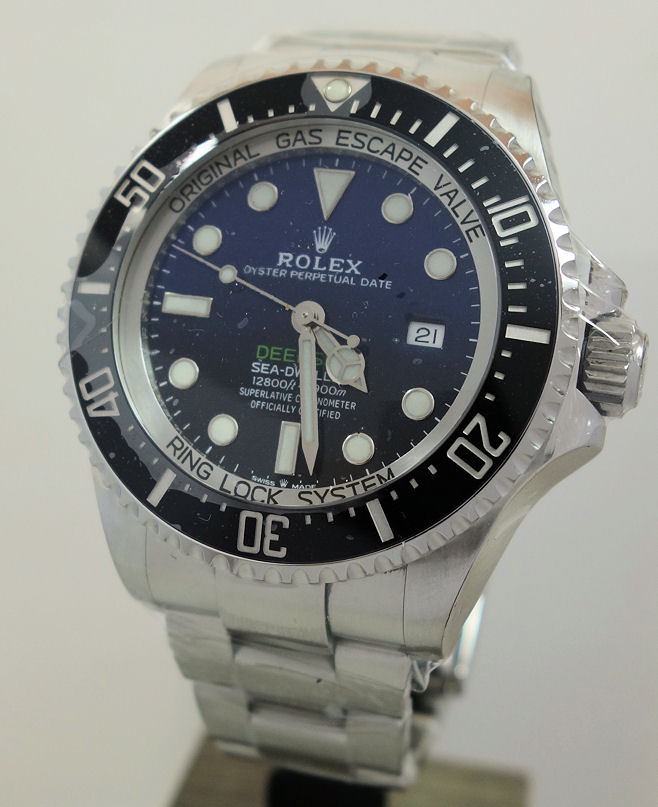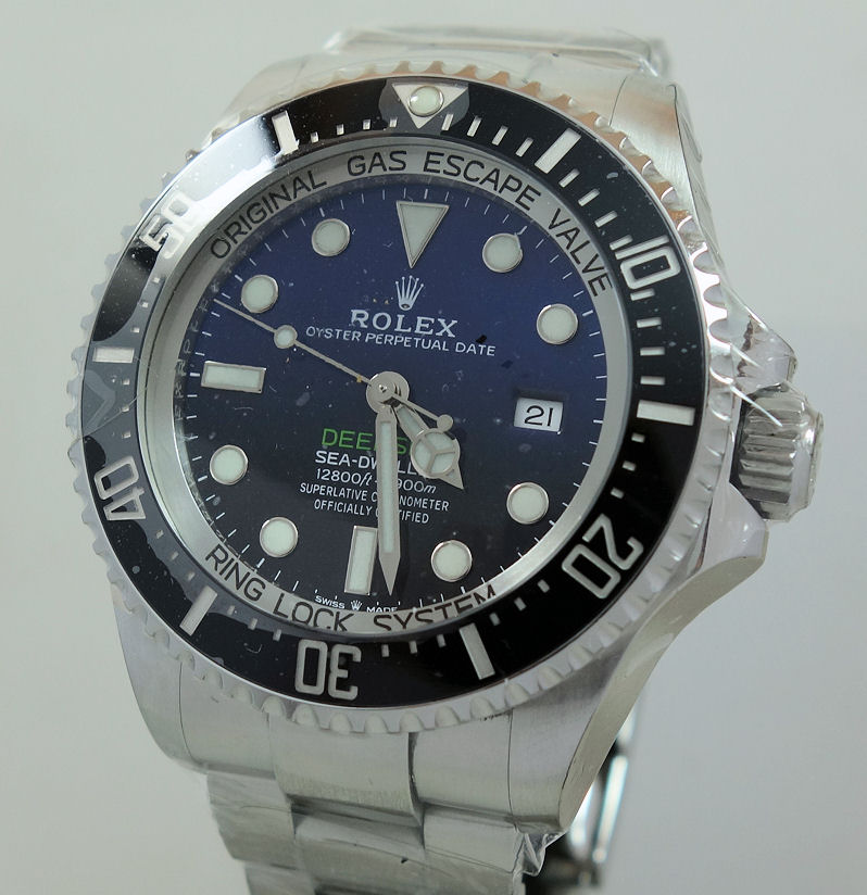 “Commemorating James Cameron’s historic solo dive. From brilliant blue to bottomless black, its two-colour gradient dial celebrates one man’s journey to the deepest place on earth: the bottom of the Mariana Trench. Waterproof to a depth of 3,900 metres (12,800 feet) with a unidirectional 60-minute rotatable bezel, the Rolex Deepsea is amongst the ultra-resistant divers’ watches engineered by Rolex for deep-sea exploration.”