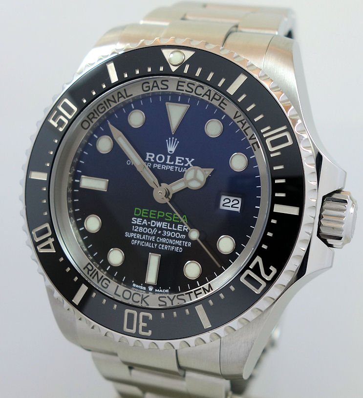 “Commemorating James Cameron’s historic solo dive. From brilliant blue to bottomless black, its two-colour gradient dial celebrates one man’s journey to the deepest place on earth: the bottom of the Mariana Trench. Waterproof to a depth of 3,900 metres (12,800 feet) with a unidirectional 60-minute rotatable bezel, the Rolex Deepsea is amongst the ultra-resistant divers’ watches engineered by Rolex for deep-sea exploration.”