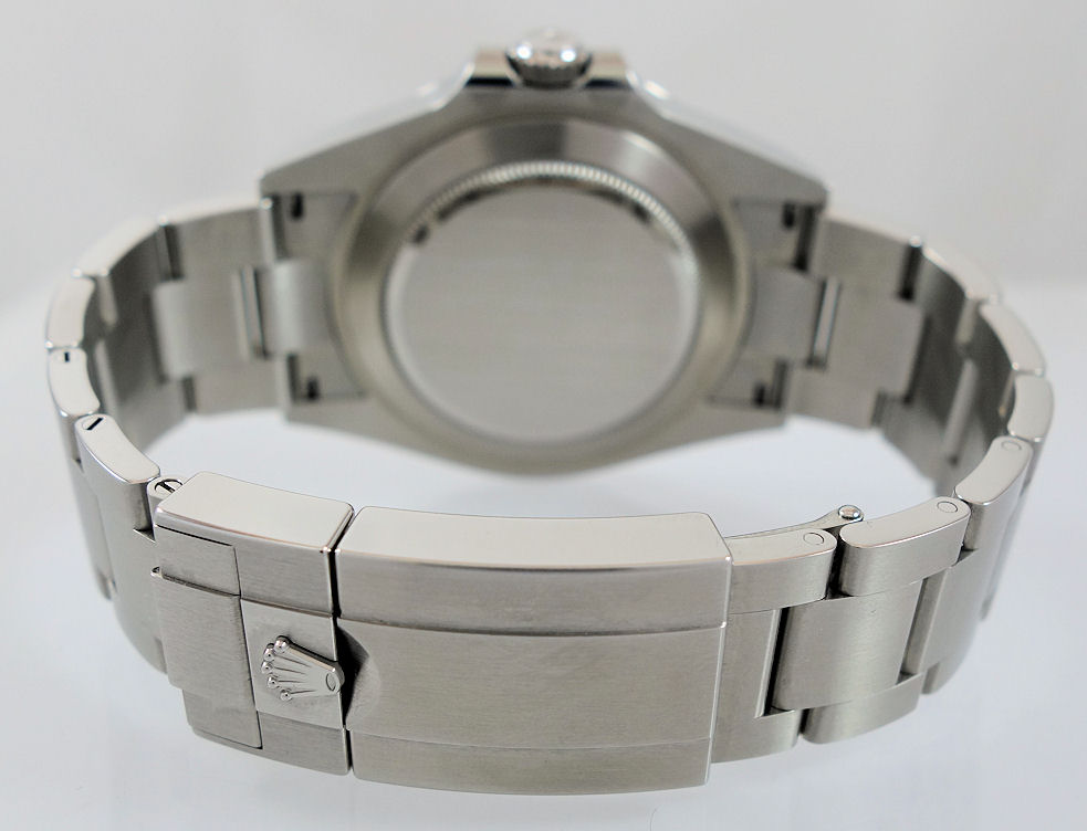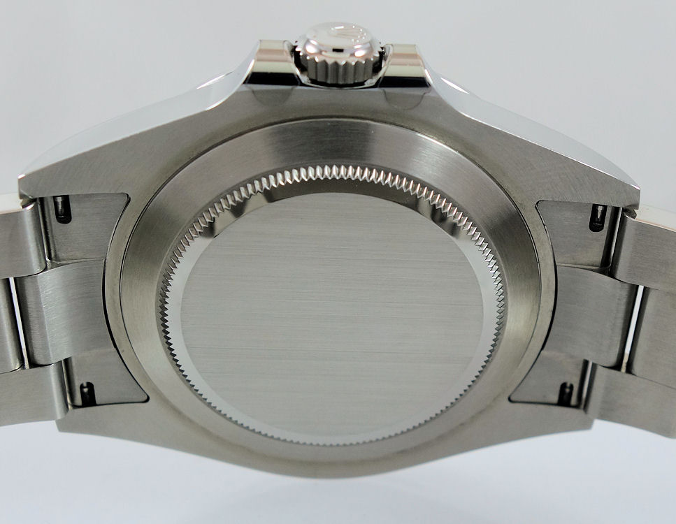 Stainless-steel Oyster case with screw-down triplock winding crown. Fixed, 24-hour graduated bezel. Scratch resistant Sapphire crystal glass with cyclops over the date for magnification.