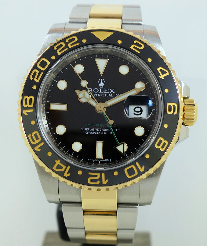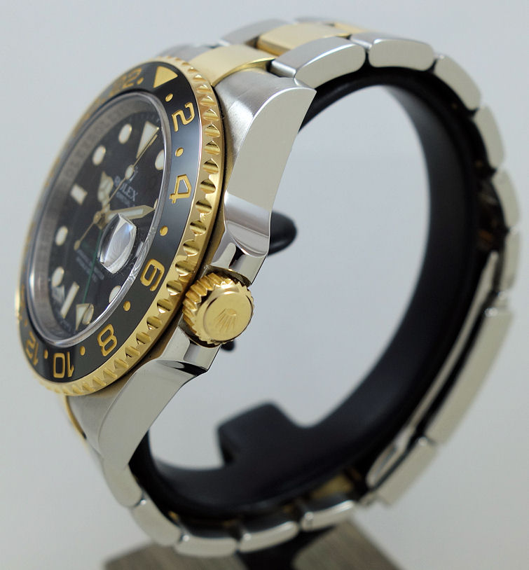 | Case | Stainless-steel Oyster case with 18k Yellow-Gold bezel; black/gold 24hr Ceramic insert and Sapphire crystal glass. |