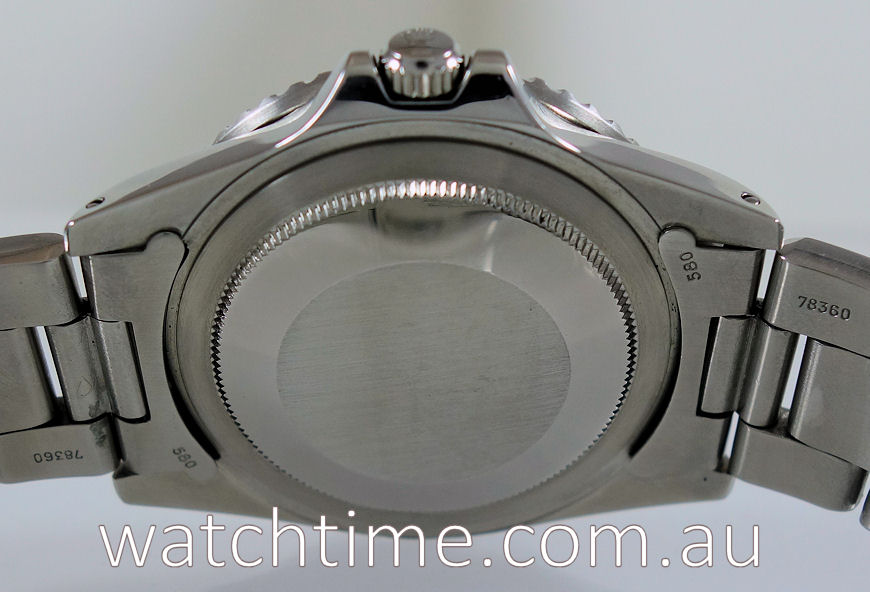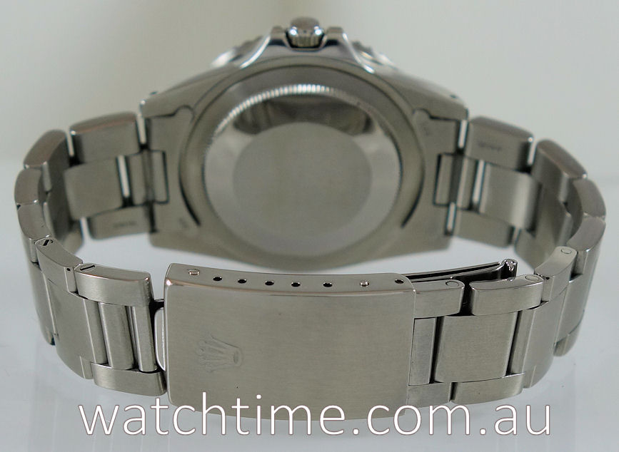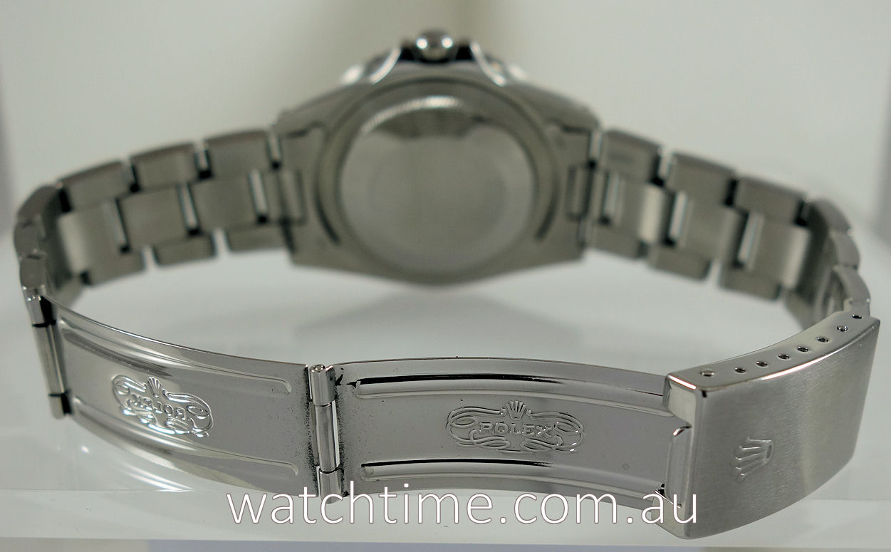 Stainless-steel Oyster case, screw-down crown and plexiglas. Bi-directional bezel with 24-hr “Pepsi” blue / red insert.