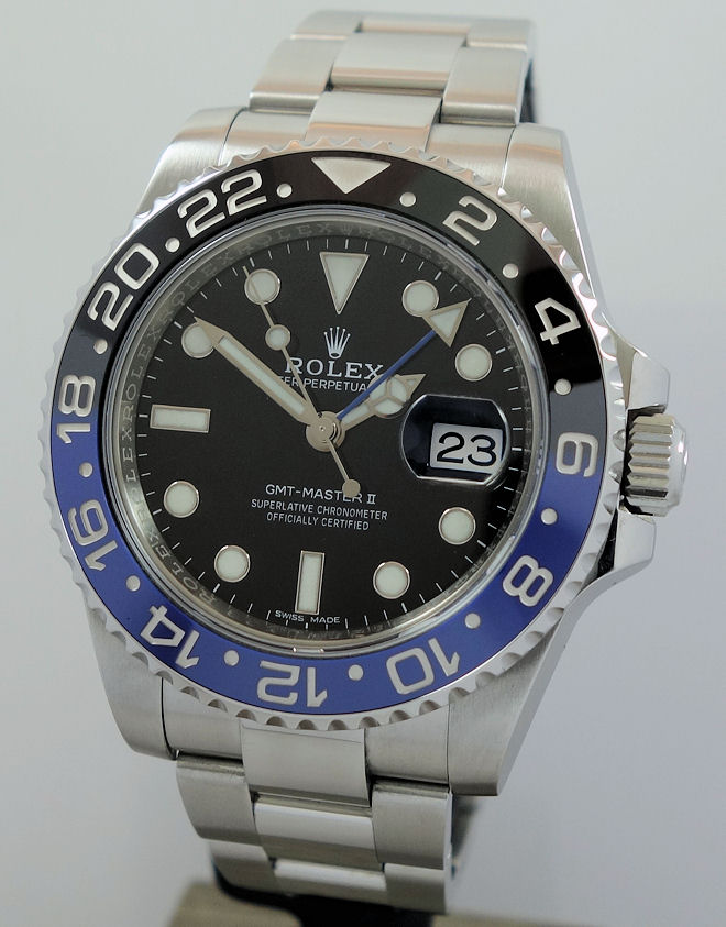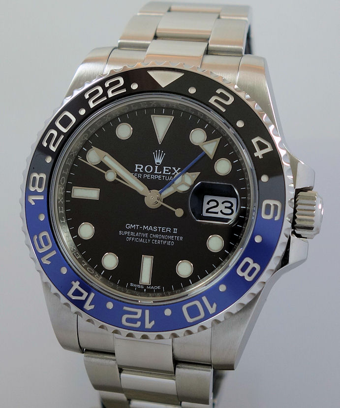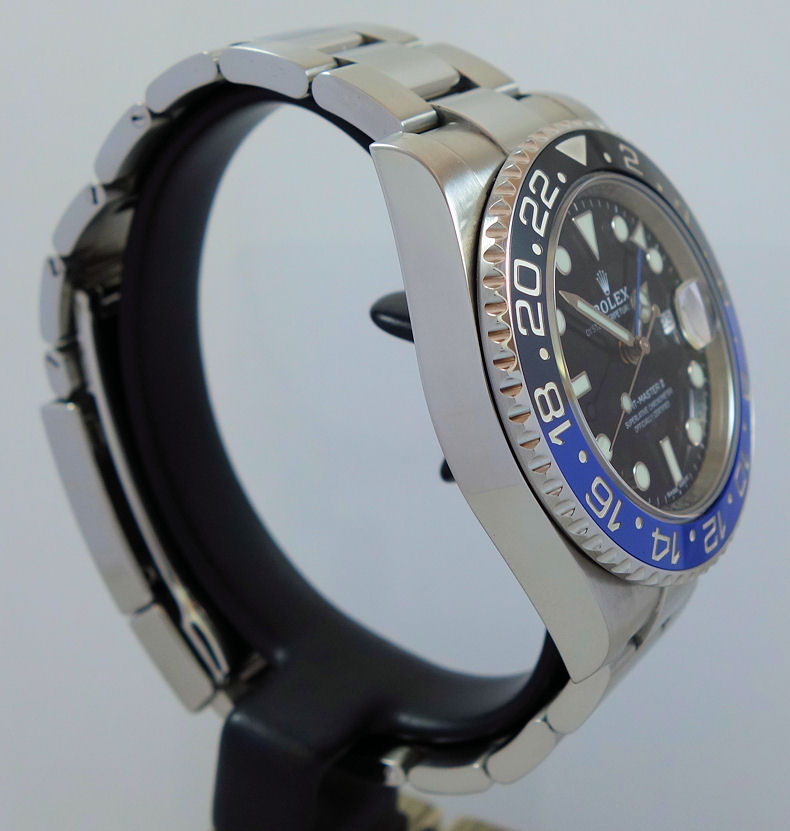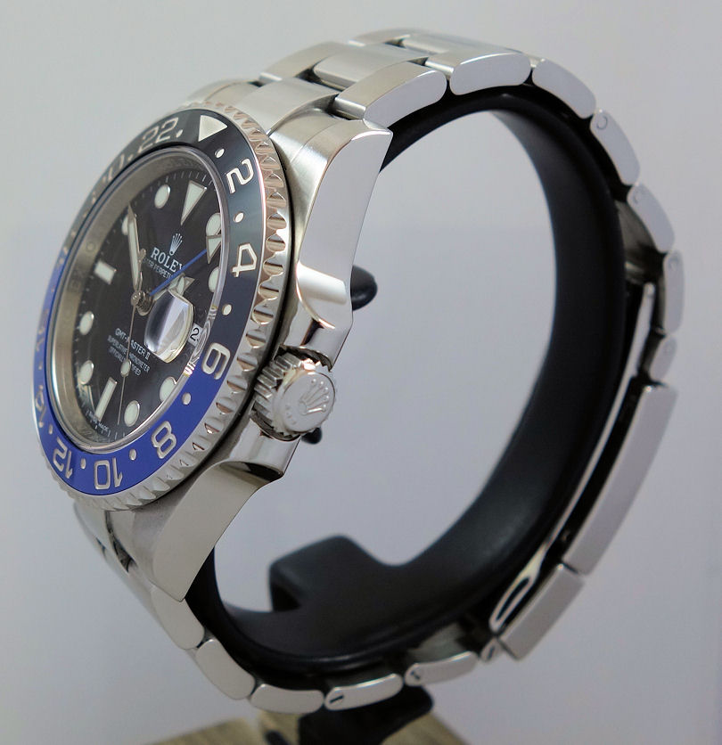 | Case | Stainless-Steel Oyster case with screw-down crown and Sapphire crystal. Rotating bezel with blue and black 24-hr ceramic insert for GMT function. |