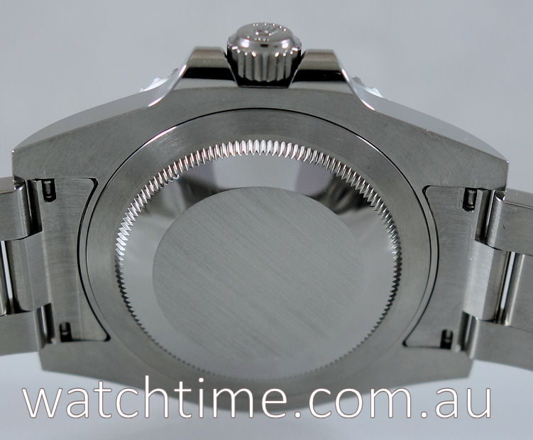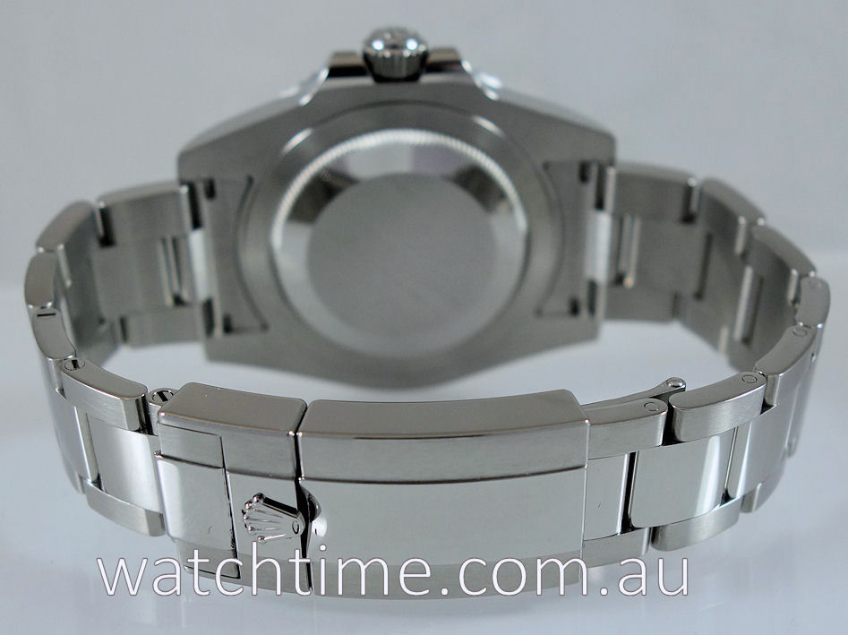 Stainless-Steel Oyster case with screw-down crown and Sapphire crystal. Rotating bezel with blue and black 24-hr ceramic insert for GMT function.