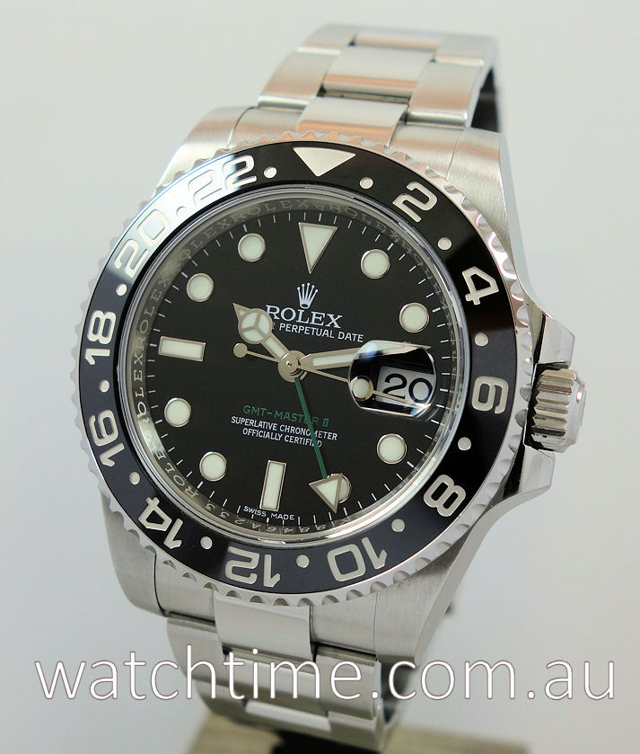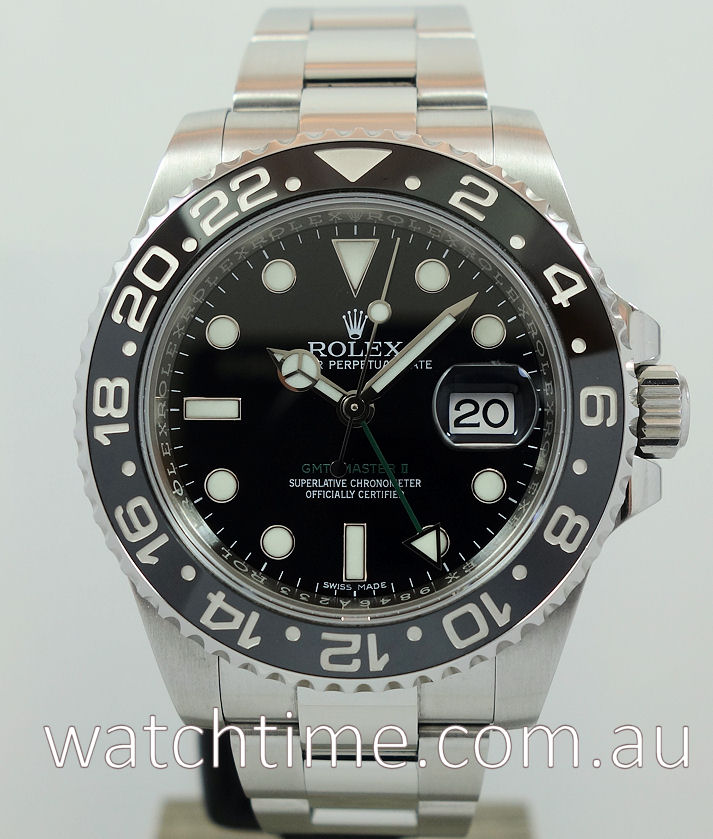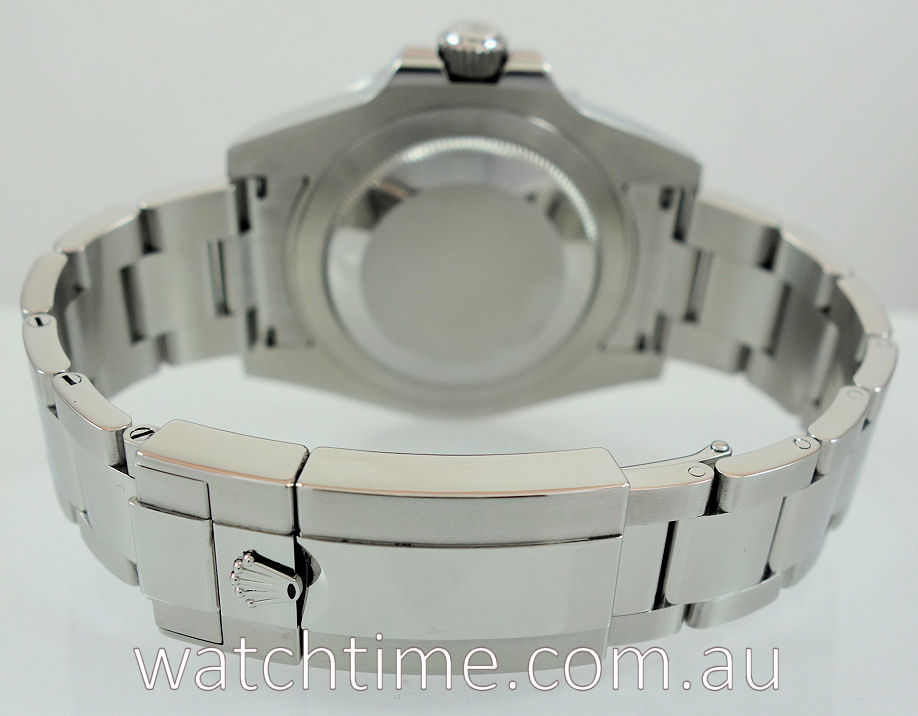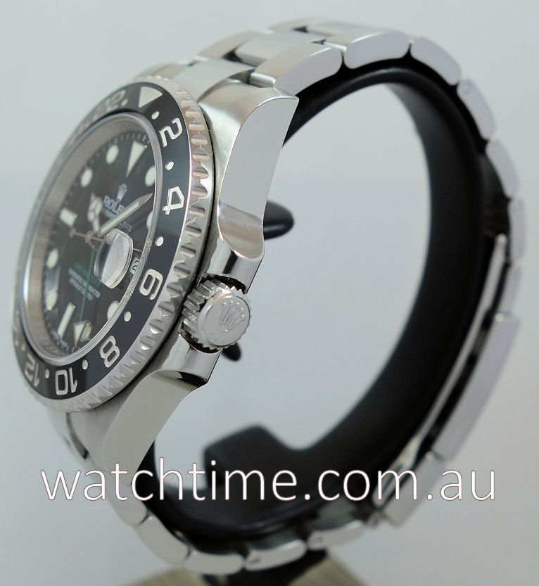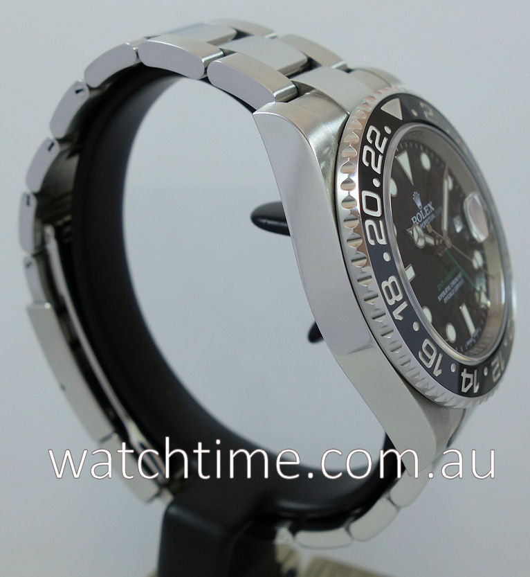 | Case | Stainless-Steel Oyster case with screw-down crown and Sapphire crystal. Rotating bezel with black 24-hr ceramic insert for GMT function. |
