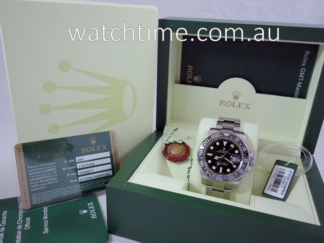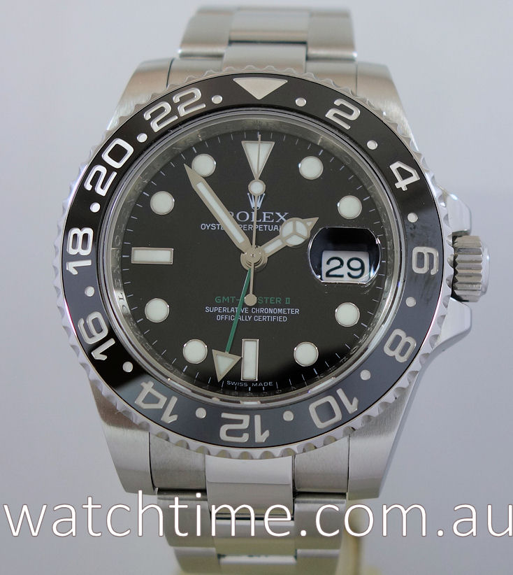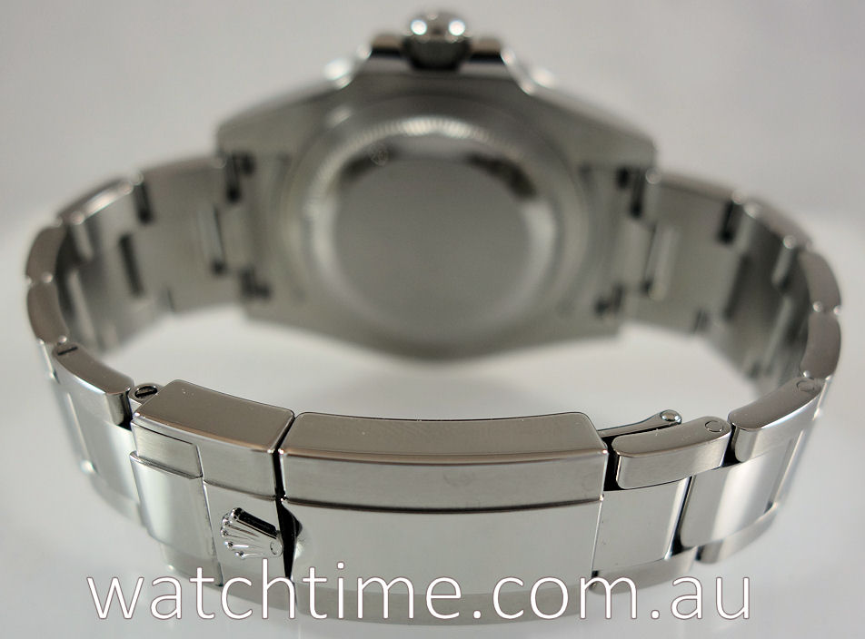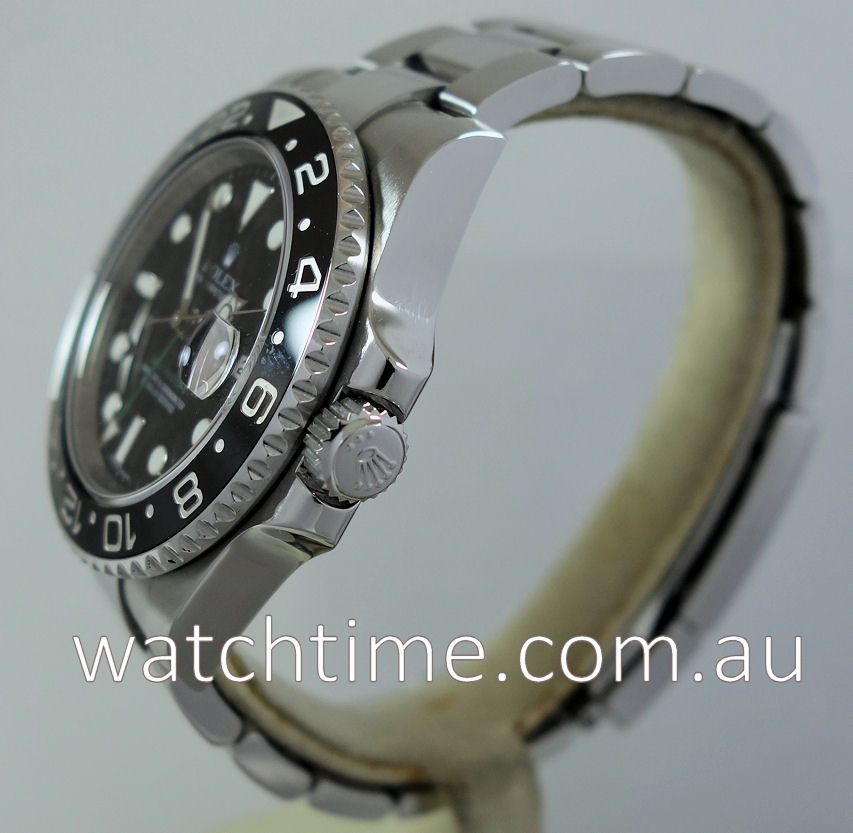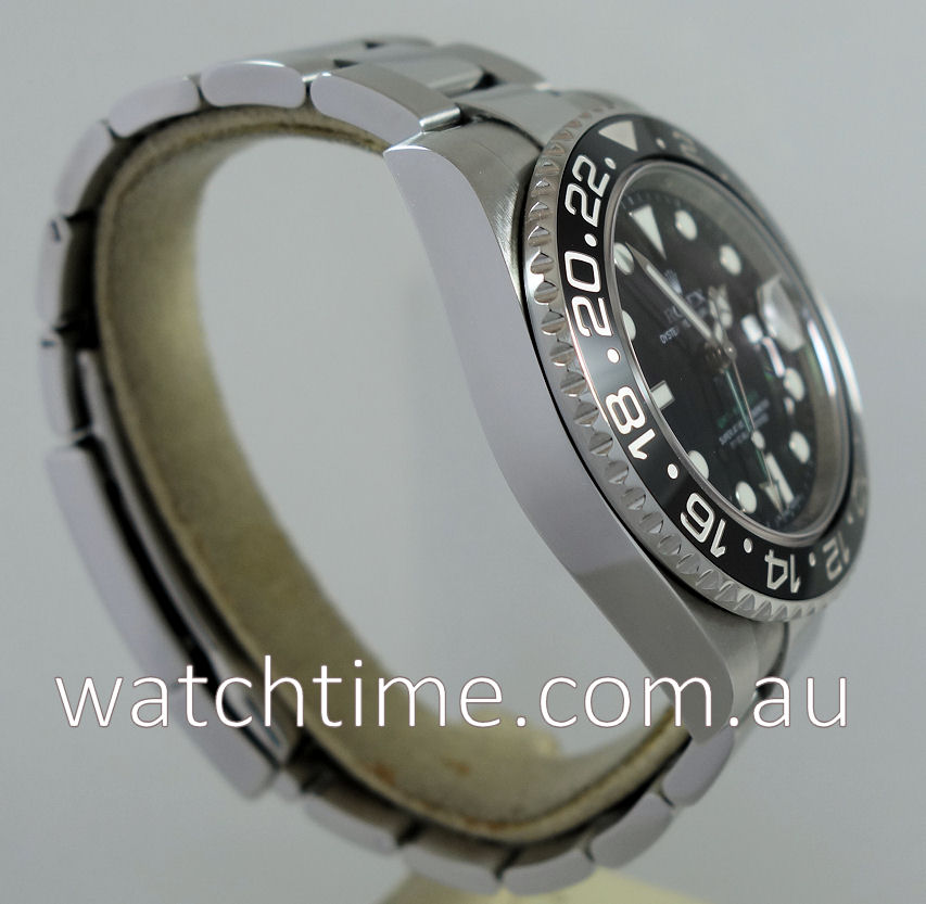 | Case | Stainless-Steel Oyster case with screw-down crown and Sapphire crystal. Rotating bezel with black 24-hr ceramic insert for GMT function. |