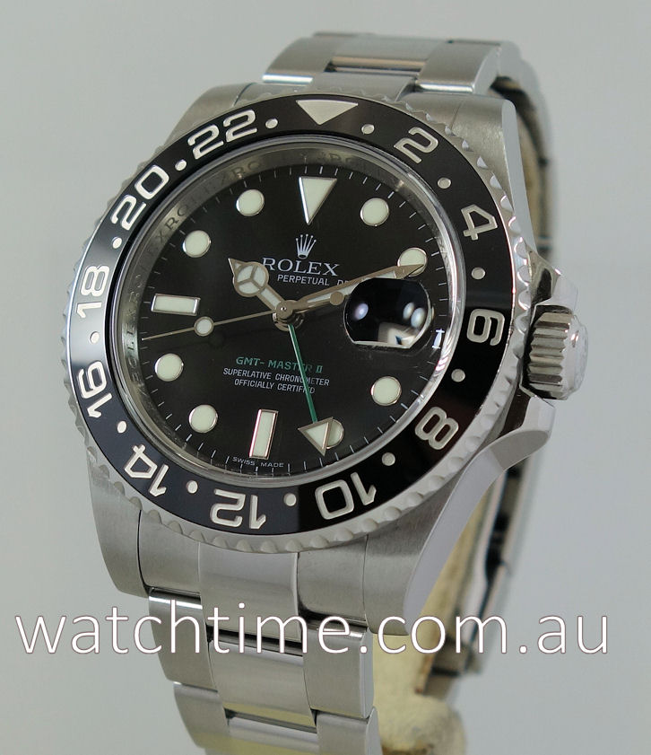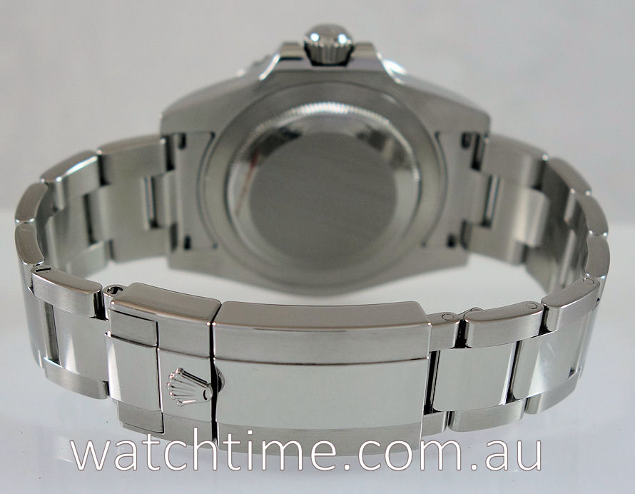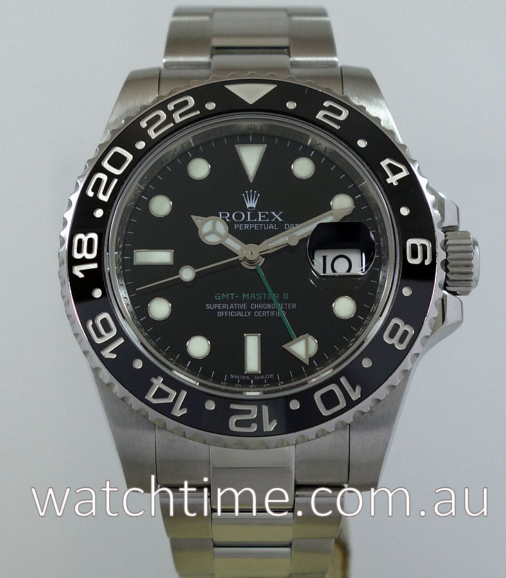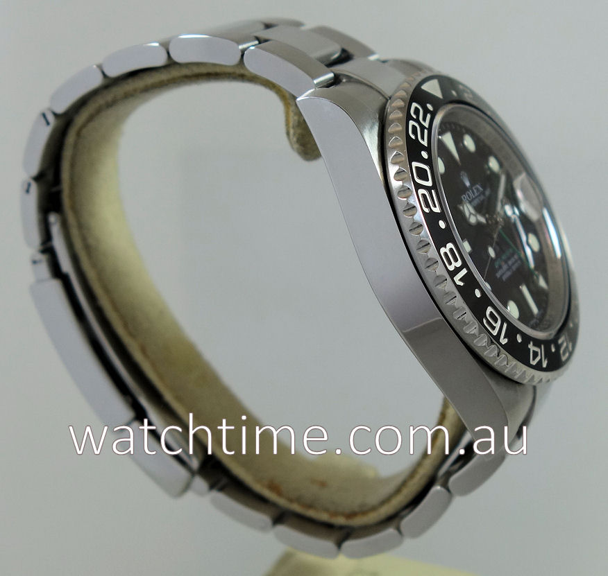 | Case | Stainless-Steel Oyster case with screw-down crown and Sapphire crystal. Rotating bezel with black 24-hr ceramic insert for GMT function. |