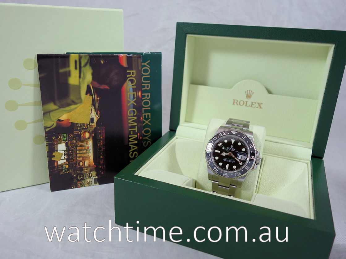 | Case | Stainless-Steel Oyster case with screw-down crown and Sapphire crystal. Rotating bezel with black 24-hr ceramic insert for GMT function. |