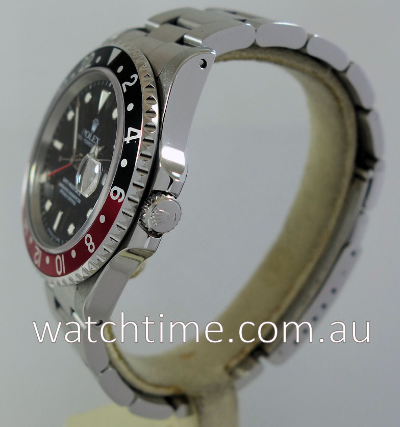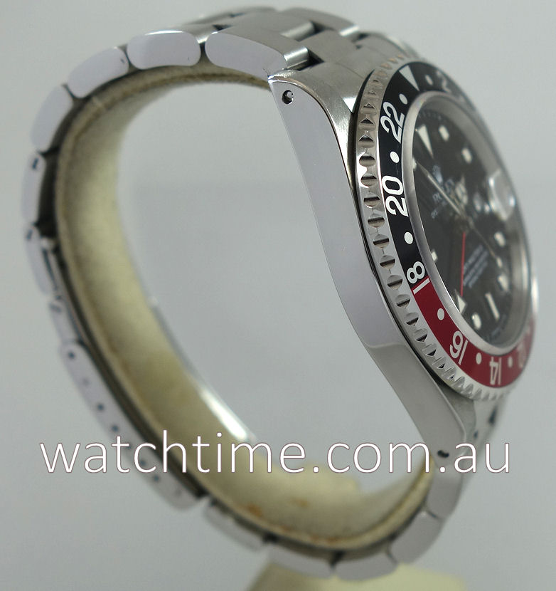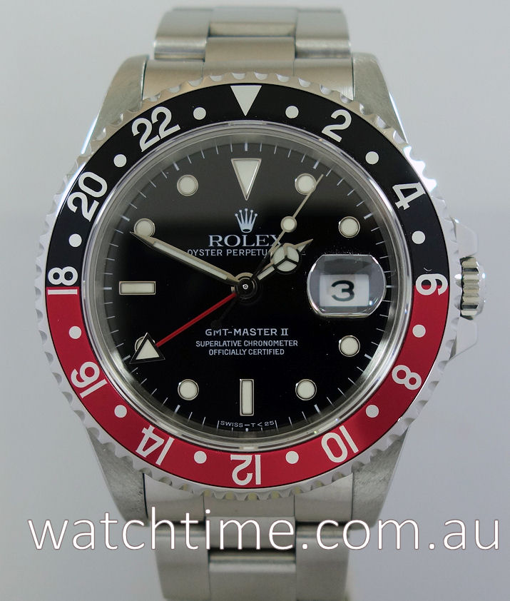 | Dial | Black with luminous hands and hour markers, red-arrow GMT hand and date at 3 h position. |