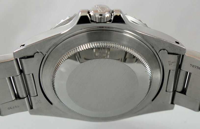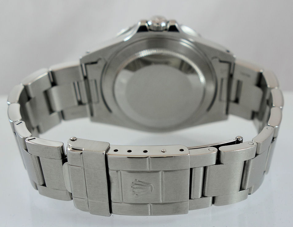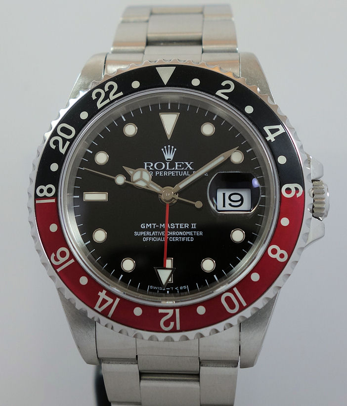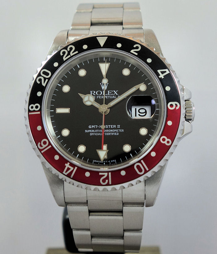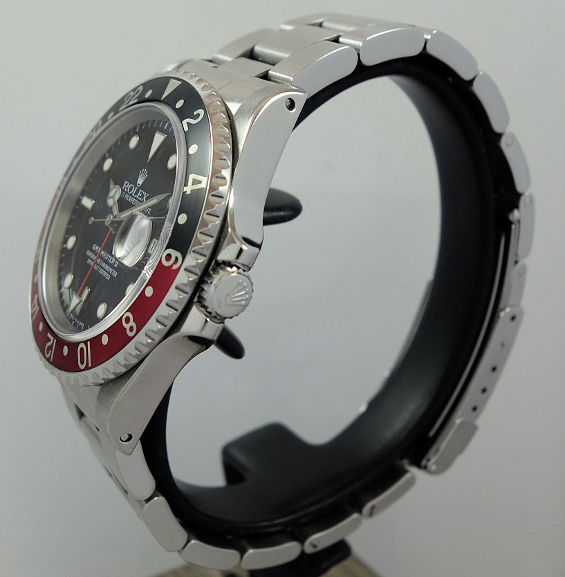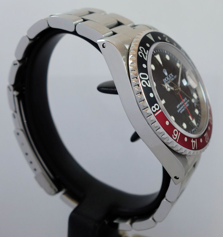 Stainless-steel Oyster screw-back case with screw-down crown and “Coke” red/black 24-hr rotating bezel. Sapphire crystal glass.