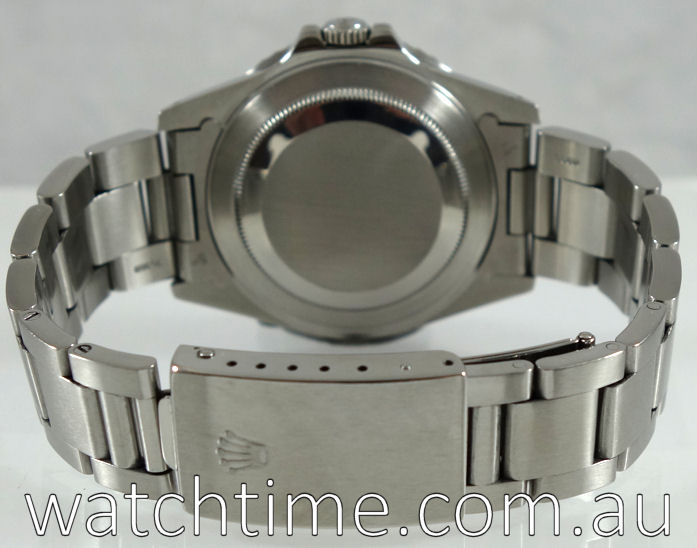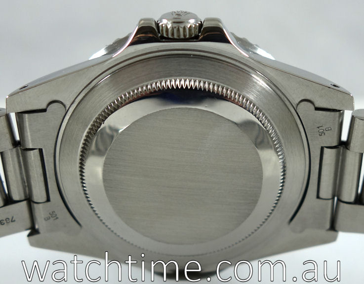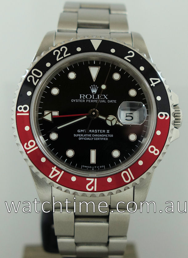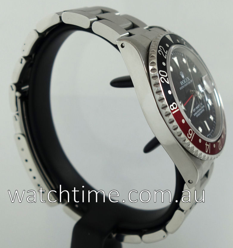 Stainless-steel Oyster screw-back case with screw-down crown and “Coke” red/black 24-hr rotating bezel. Sapphire crystal glass.