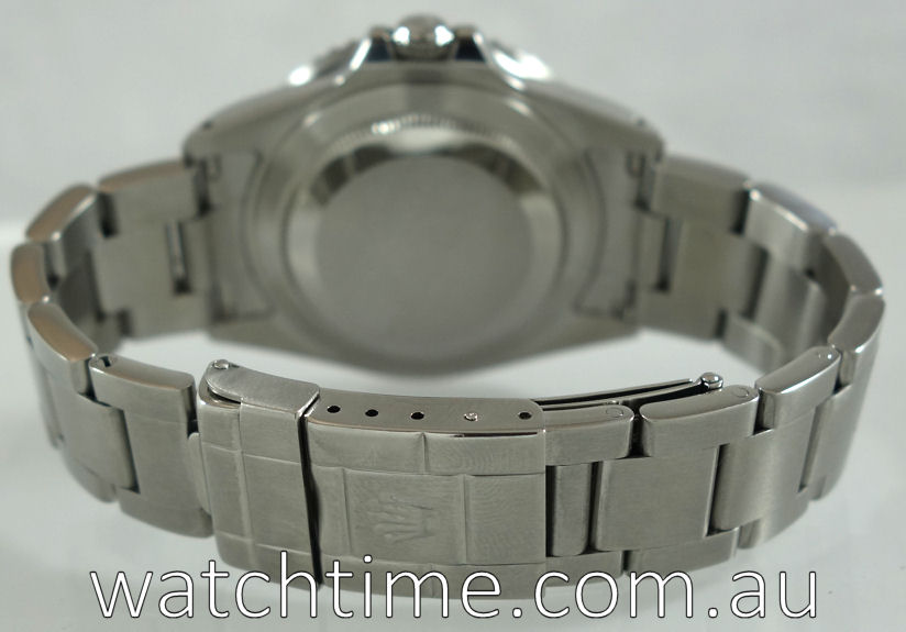 | Case | Stainless-steel Oyster screw-back case with screw-down crown and “Coke” red/black 24-hr rotating bezel. Sapphire crystal glass. |