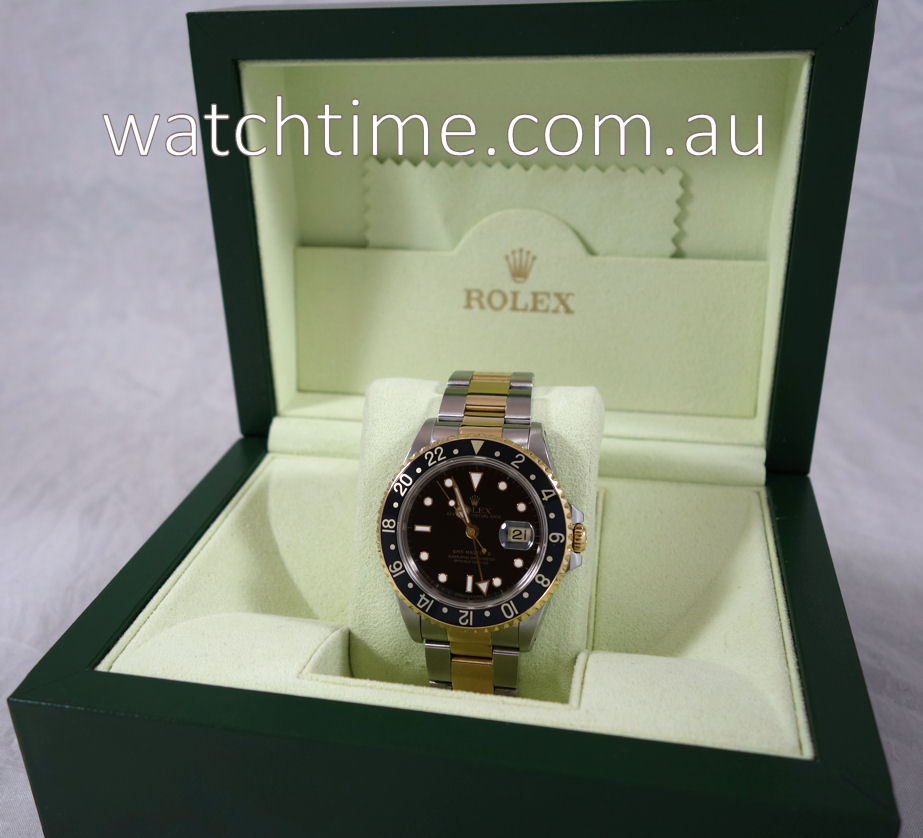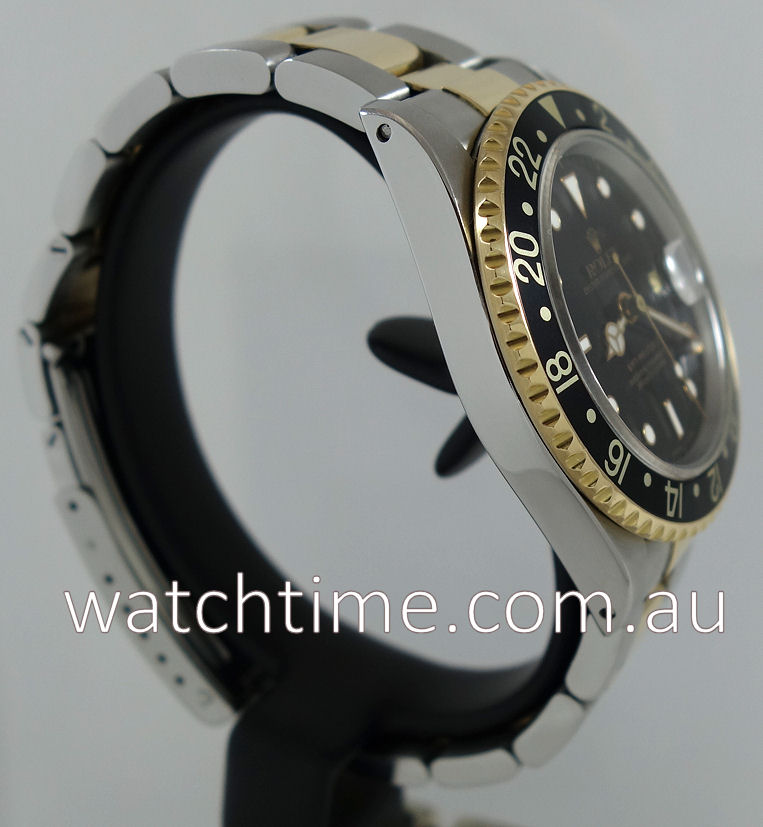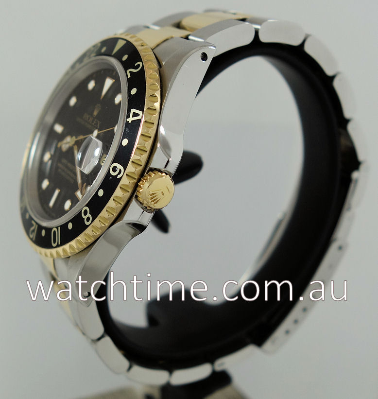 | Case | Stainless-steel Oyster case, 18k Yellow-Gold bezel with black/gold 24-hr insert, screw-down winding crown and Sapphire crystal glass. |