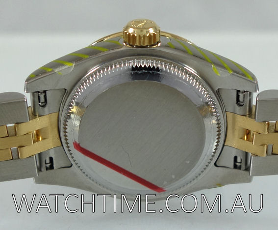 | Case | Stainless-steel Oyster case, 18ct Yellow-Gold fluted Diamond bezel, screw-down crown and Sapphire crystal glass. |