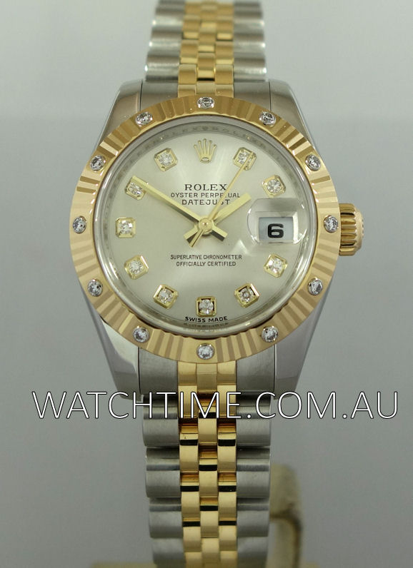 | Dial | Silver dial with 10 Diamonds, Gold hands and date at 3 o’clock. |