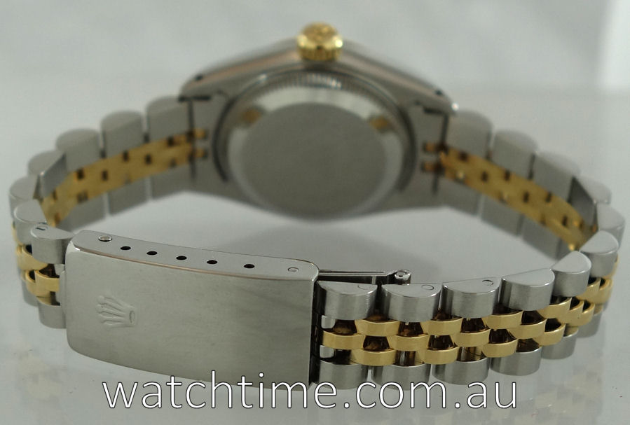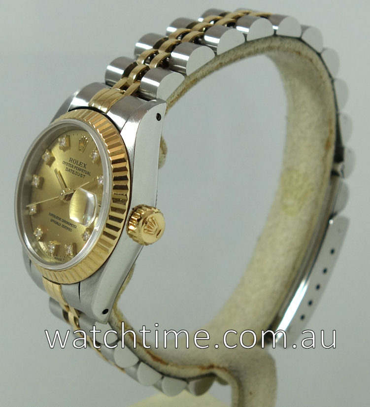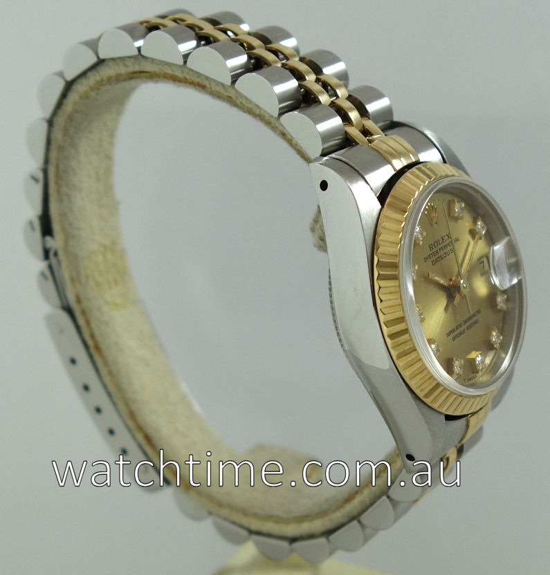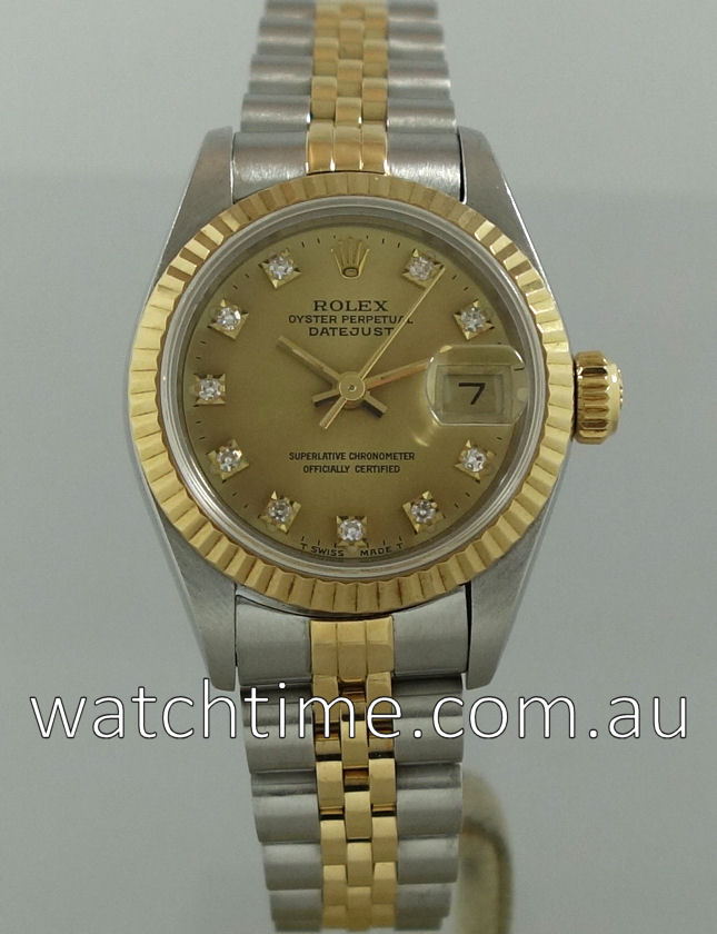 | Dial | Champagne Gold dial with factory Diamond hour markers, gold hands and date at 3 h pos. |