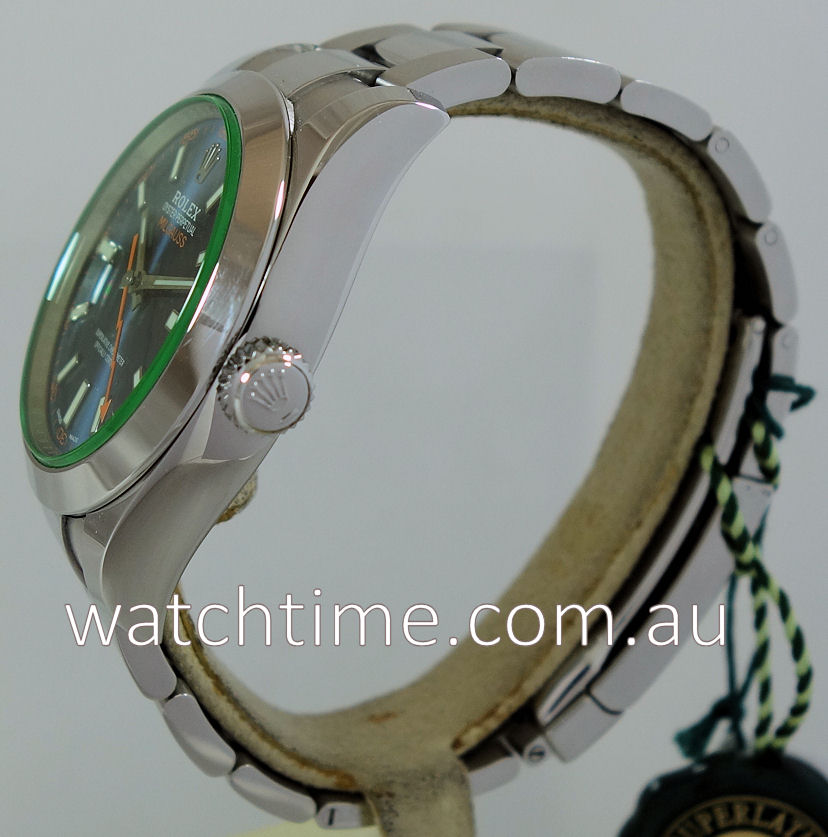| Case | Stainless Steel Oyster case with screw-down winding, polished bezel and GREEN sapphire cyrstal. |