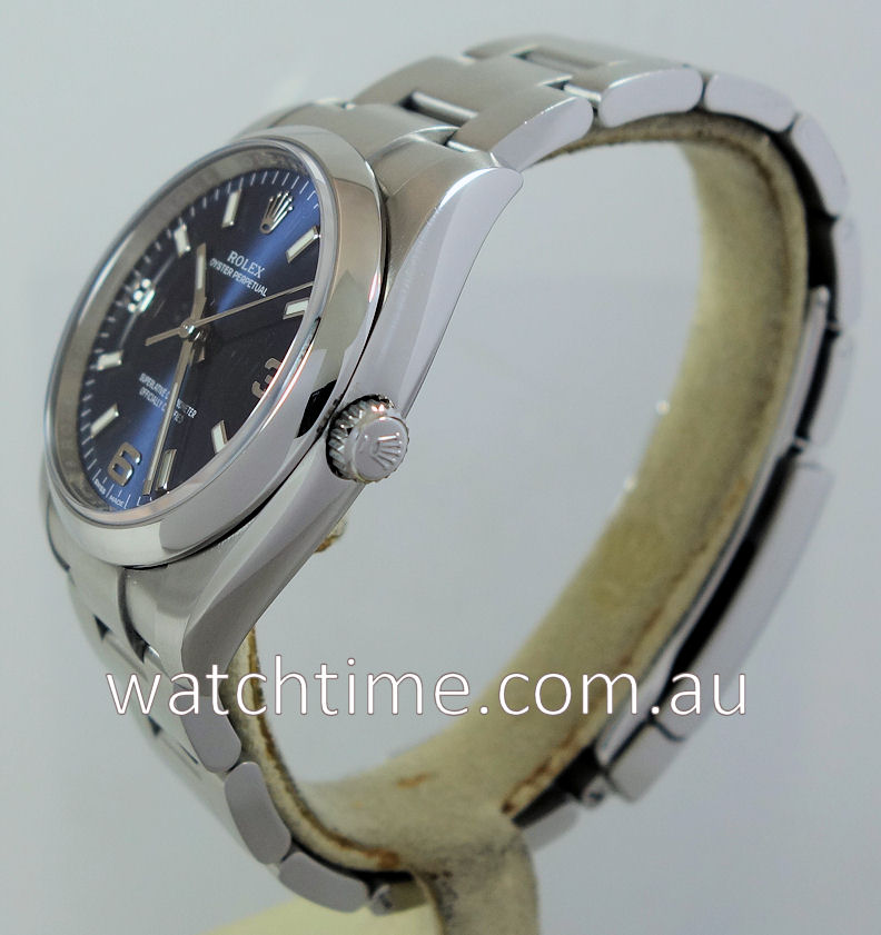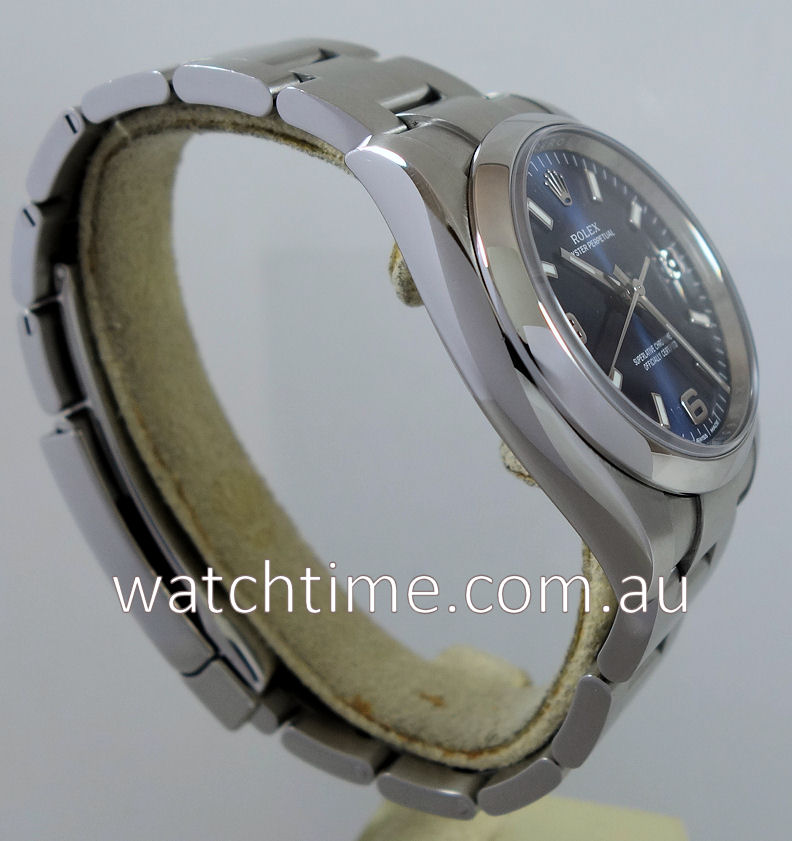 | Dial | Blue sunburst dial, applied Arabic hours at 3, 6 and 9 along luminous hour indexes and matching hands. |