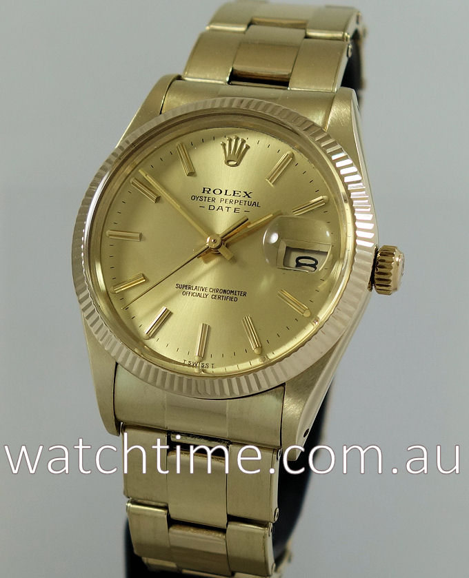 | Dial | Gold sunburst with applied hour indices and gold hands. Date at 3 h pos. |