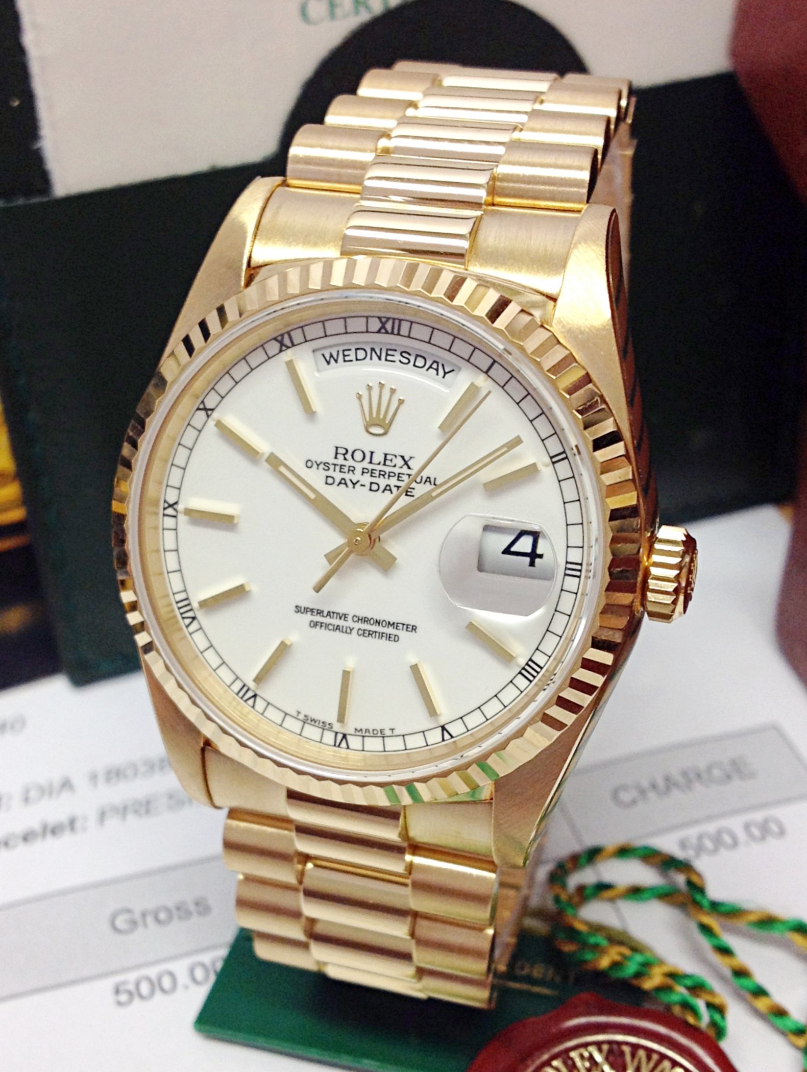 | Dial | White dial with applied gold Roman numerals and gold hands. Date at 3 o’clock and day above 12 o’clock. |