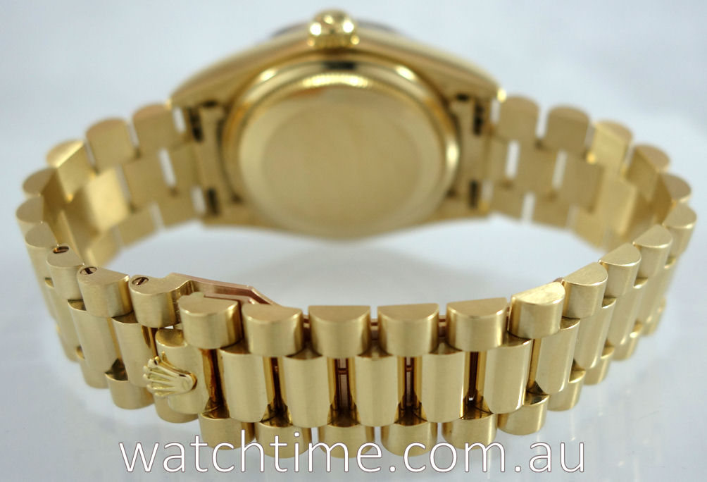 | Dial | Pave Diamond dial with blue Sapphires to mark the hours and black/gold hands. Day aperture at 12 o’clock and date window at 3 o’clock. |